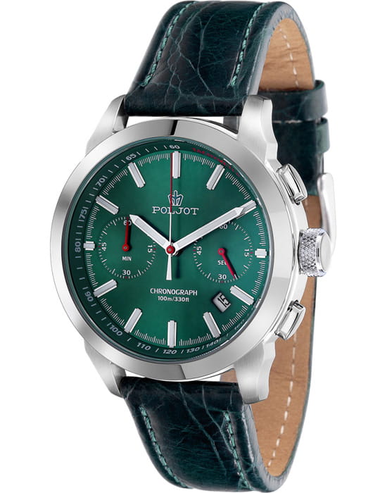 Poljot 6S21.741030 — классические мужские часы, в которых традиции российского часового мастерства сочетаются с современным дизайном. Корпус из нержавеющей стали подчёркивает солидность и надёжность модели, а насыщенный зелёный циферблат с лучевой текстурой придаёт образу выразительность и глубину. Два дополнительных счётчика хронографаХронографФункция позволяет измерять отрезки времени с особой точностью: часы, минуты, секунды. Верным признаком хронографа является наличие на циферблате 3 дополнительных окошек-счётчиков. обеспечивают точное измерение интервалов времени, дополняя функциональность часов. Контрастные стрелки и метки с люминесцентным покрытиемЛюминесцентное покрытиеПозволяет считывать показания времени в темноте. Производители наносят на стрелки, часовые индексы, безель или поверхность циферблата светонакопительный состав, дающий холодное свечение. обеспечивают отличную читаемость даже в условиях слабого освещения. Прочное минеральное стеклоМинеральное стеклоМинеральное стекло представляет собой искусственно выращенный минерал кварца. Такое стекло отличается особой устойчивостью к повреждениям и царапинам. Уступает по некоторым качествам сапфировому стеклу. защищает циферблат от царапин, а ремешок из натуральной кожи с классической пряжкой гарантирует комфорт и элегантную посадку на запястье. Poljot — это надёжный спутник современного мужчины, объединяющий точность, стиль и характер.