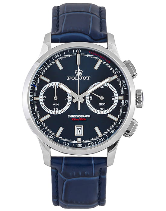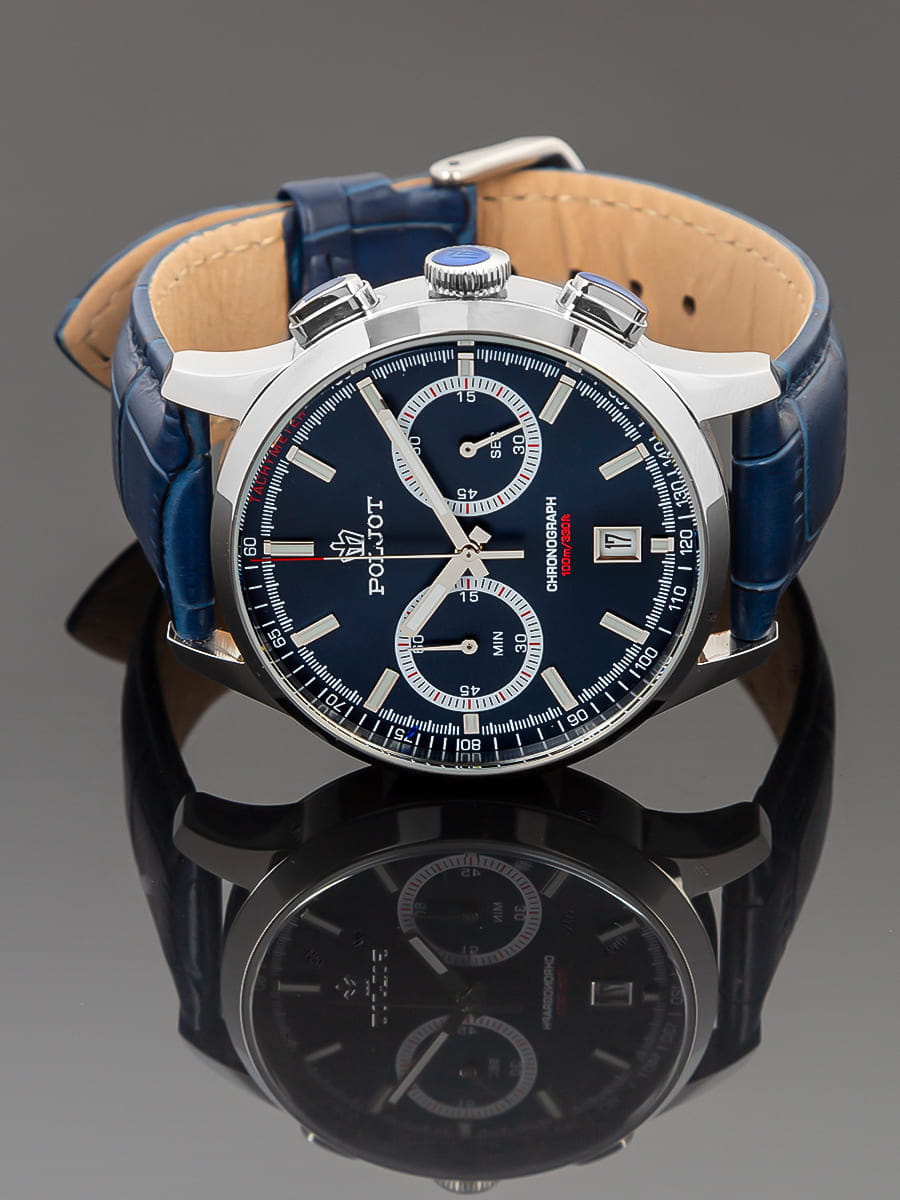 Poljot 6S21.901211 — современные мужские часы с выразительным спортивным дизайном и надёжной функциональностью. Корпус из нержавеющей стали подчёркивает прочность и уверенный характер модели, а глубокий циферблат с счётчиками хронографаХронографФункция позволяет измерять отрезки времени с особой точностью: часы, минуты, секунды. Верным признаком хронографа является наличие на циферблате 3 дополнительных окошек-счётчиков. и аккуратным окном даты на позиции «6 часов» придаёт часам динамичный вид. Контрастные стрелки и метки с люминесцентным покрытиемЛюминесцентное покрытиеПозволяет считывать показания времени в темноте. Производители наносят на стрелки, часовые индексы, безель или поверхность циферблата светонакопительный состав, дающий холодное свечение. обеспечивают удобство считывания информации в любое время суток, а внешняя шкала тахиметраТахиметрРазмеченная шкала, располагается на ободке или безеле часов. Тахиметр позволяет рассчитать скорость на определённом участке пути, расстояние измеряется в километрах или милях. добавляет спортивную функциональность. Прочное минеральное стеклоМинеральное стеклоМинеральное стекло представляет собой искусственно выращенный минерал кварца. Такое стекло отличается особой устойчивостью к повреждениям и царапинам. Уступает по некоторым качествам сапфировому стеклу. защищает циферблат от царапин, а ремешок из натуральной кожи гарантирует комфорт и элегантную посадку на запястье. Poljot — это гармония классики и спортивного духа, созданная для мужчин, ценящих точность, надёжность и уверенный стиль.