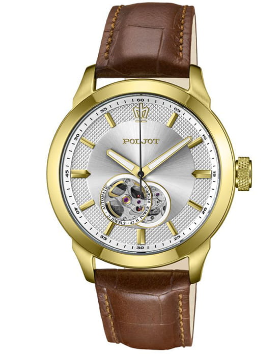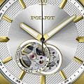 Poljot 82S0.746095 — элегантные механические мужские часы с автоподзаводом, сочетающие традиции отечественного часового производства и классический дизайн. Корпус из нержавеющей стали с тёплым золотистым с PVD-покрытиемPVDУльтратонкое покрытие наносится в технике вакуумного напыления, сочетает в себе нитрид титана особой прочности со слоем золота или оксида хрома. Несёт в себе декоративную или защитную функцию. придаёт модели благородный характер, а серебристый циферблат с чёткой разметкой подчёркивает функциональную строгость стиля. Надёжный механизм с автоподзаводом обеспечивает плавный ход стрелок и стабильную работу. Прочное минеральное стеклоМинеральное стеклоМинеральное стекло представляет собой искусственно выращенный минерал кварца. Такое стекло отличается особой устойчивостью к повреждениям и царапинам. Уступает по некоторым качествам сапфировому стеклу. защищает циферблат от повреждений, а ремешок из натуральной кожи с классической пряжкой добавляет образу утончённости и комфорта. Poljot — это воплощение надёжности, традиции и сдержанной элегантности, идеально подходящее для повседневного делового стиля.