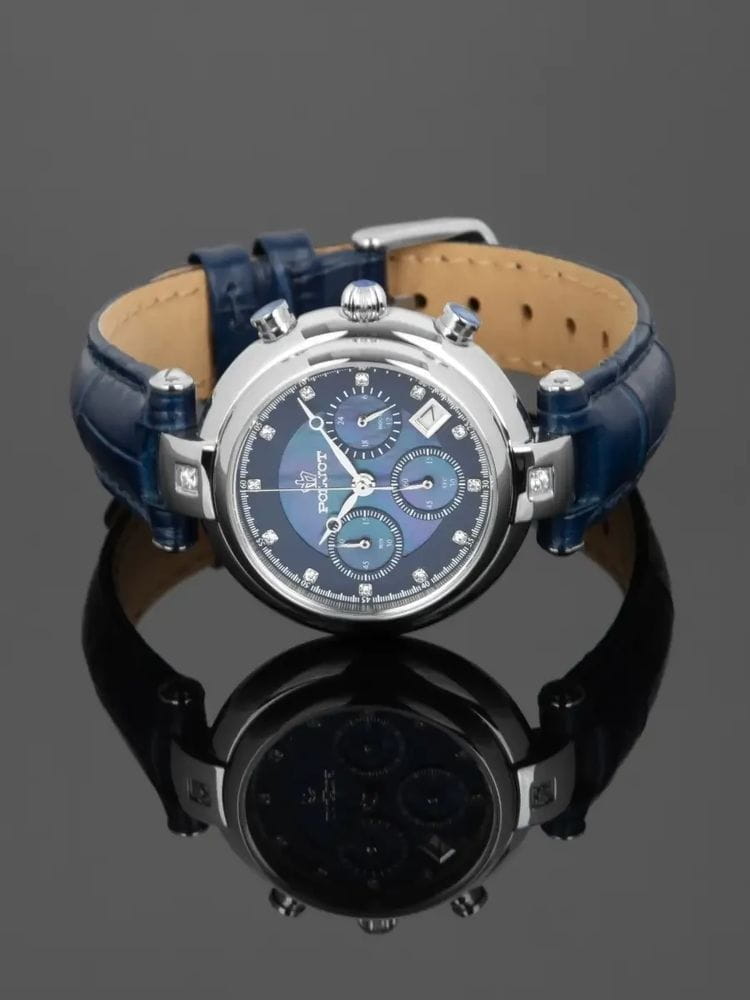 Poljot FS20.671007 — изящные женские часы с выразительным дизайном и функциональностью, воплощающие баланс классики и современности. Корпус из нержавеющей стали подчёркивает утончённость силуэта, а насыщенный циферблат с тремя счётчиками хронографаХронографФункция позволяет измерять отрезки времени с особой точностью: часы, минуты, секунды. Верным признаком хронографа является наличие на циферблате 3 дополнительных окошек-счётчиков. придаёт модели динамичный и технически точный характер. Окно даты добавляет практичности, сохраняя гармоничную симметрию циферблата. Изогнутые ушки корпуса и декоративные элементы придают часам изысканный женственный акцент. Прочное минеральное стеклоМинеральное стеклоМинеральное стекло представляет собой искусственно выращенный минерал кварца. Такое стекло отличается особой устойчивостью к повреждениям и царапинам. Уступает по некоторым качествам сапфировому стеклу. надёжно защищает поверхность, а ремешок из натуральной кожи обеспечивает комфорт и стильное прилегание к запястью. Poljot — это сочетание элегантности и функциональности, идеально подходящее для активной и уверенной в себе женщины.