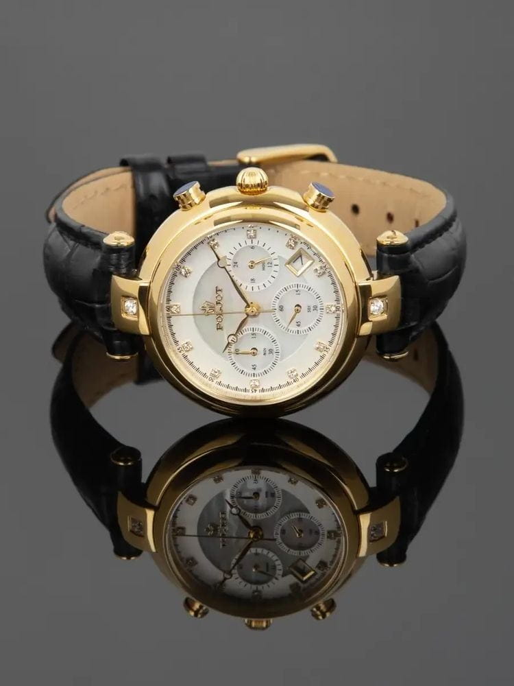 Poljot FS20.676008 — изящные женские часы с выразительным дизайном и функциональностью, воплощающие баланс классики и современности. Корпус из нержавеющей стали с PVD-покрытиемPVDУльтратонкое покрытие наносится в технике вакуумного напыления, сочетает в себе нитрид титана особой прочности со слоем золота или оксида хрома. Несёт в себе декоративную или защитную функцию. подчёркивает утончённость силуэта, а насыщенный циферблат с тремя счётчиками хронографаХронографФункция позволяет измерять отрезки времени с особой точностью: часы, минуты, секунды. Верным признаком хронографа является наличие на циферблате 3 дополнительных окошек-счётчиков. придаёт модели динамичный и технически точный характер. Окно даты добавляет практичности, сохраняя гармоничную симметрию циферблата. Изогнутые ушки корпуса и декоративные элементы придают часам изысканный женственный акцент. Прочное минеральное стеклоМинеральное стеклоМинеральное стекло представляет собой искусственно выращенный минерал кварца. Такое стекло отличается особой устойчивостью к повреждениям и царапинам. Уступает по некоторым качествам сапфировому стеклу. надёжно защищает поверхность, а ремешок из натуральной кожи обеспечивает комфорт и стильное прилегание к запястью. Poljot — это сочетание элегантности и функциональности, идеально подходящее для активной и уверенной в себе женщины.