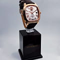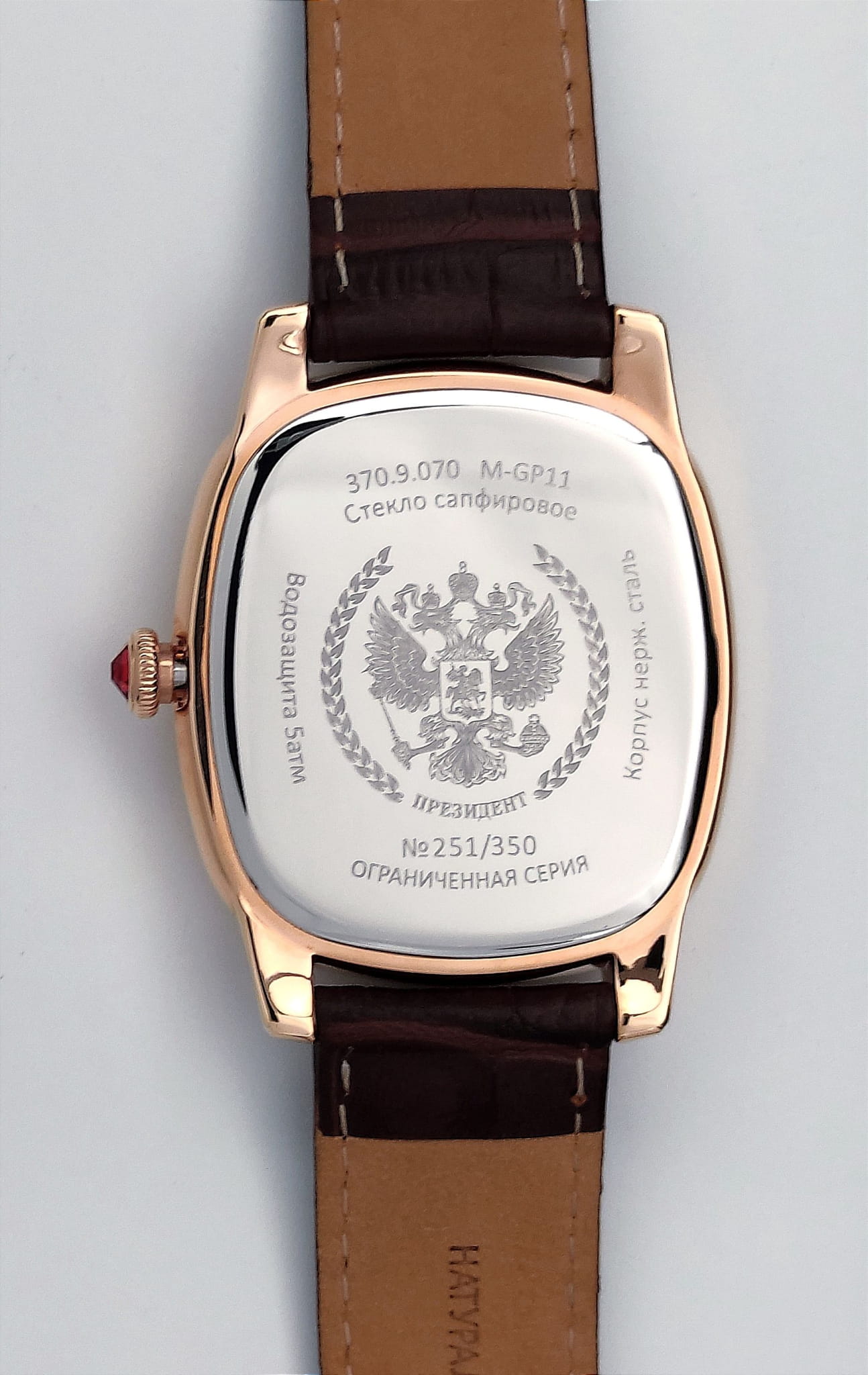 Часы «Президент» модели 3709070 — это мужские кварцевые наручные часы, сочетающие элегантный дизайн и надёжность. Механизм: японский кварцевый механизм Miyota GP11, обеспечивающий высокую точность. Функции: часы, минуты, секунды и дата. Корпус: из нержавеющей стали с PVD-покрытиемPVDУльтратонкое покрытие наносится в технике вакуумного напыления, сочетает в себе нитрид титана особой прочности со слоем золота или оксида хрома. Несёт в себе декоративную или защитную функцию. розового золота, размером 41 мм х 38 мм, толщиной 9,8 мм. Стекло: сапфировоеСапфировое стеклоПрочный и надёжный материал из кристалла сапфира синтетического происхождения, характеризующийся особой твёрдостью и устойчивостью к царапинам и повреждениям., устойчивое к царапинам. Водонепроницаемость: 5 ATM (50 метров), подходящая для повседневного использования. Ремешок: кожаный, шириной 20 мм, с классической застёжкой. Эти часы выпущены ограниченным тиражом в 350 экземпляров, что подчёркивает их эксклюзивность и статус.