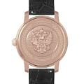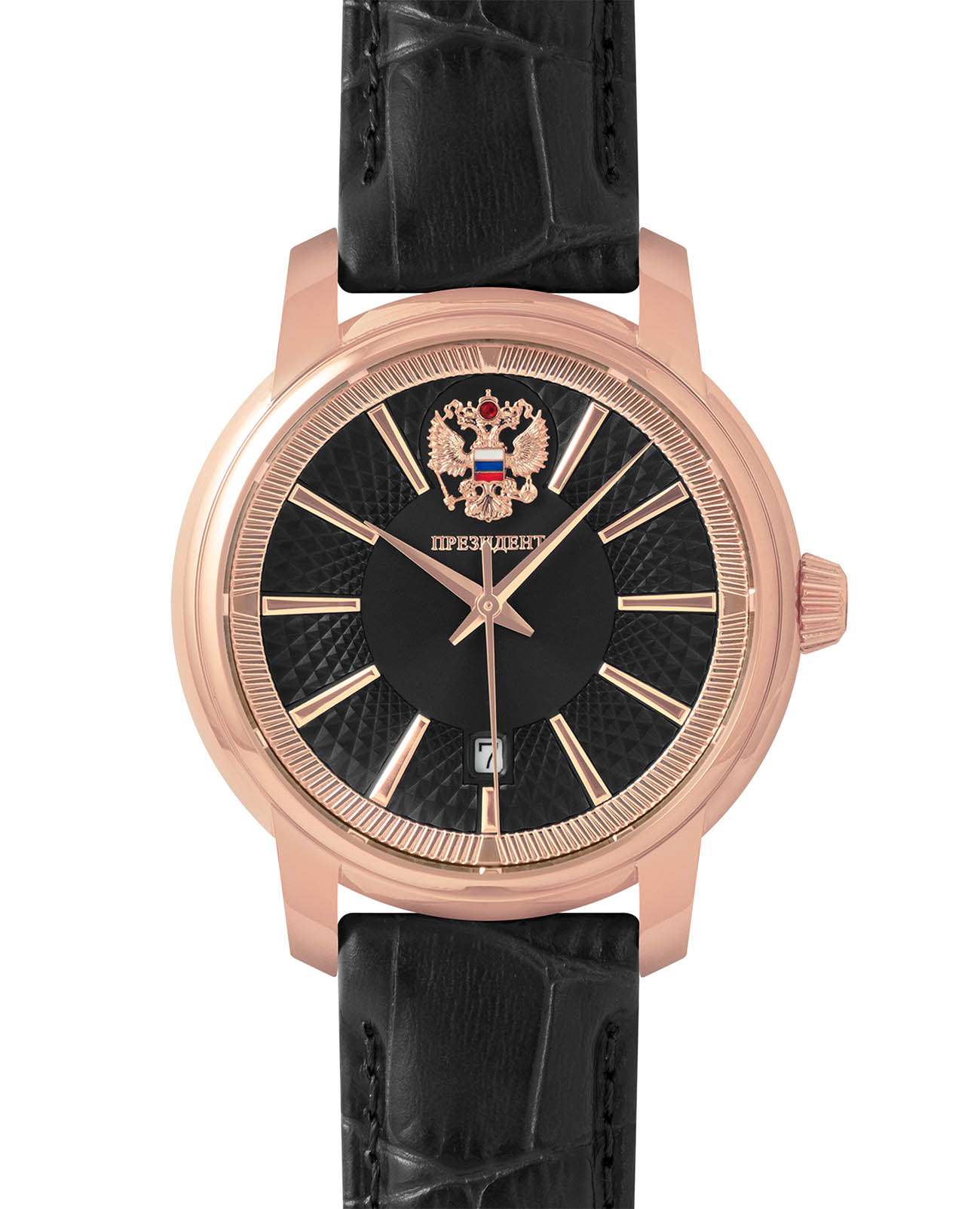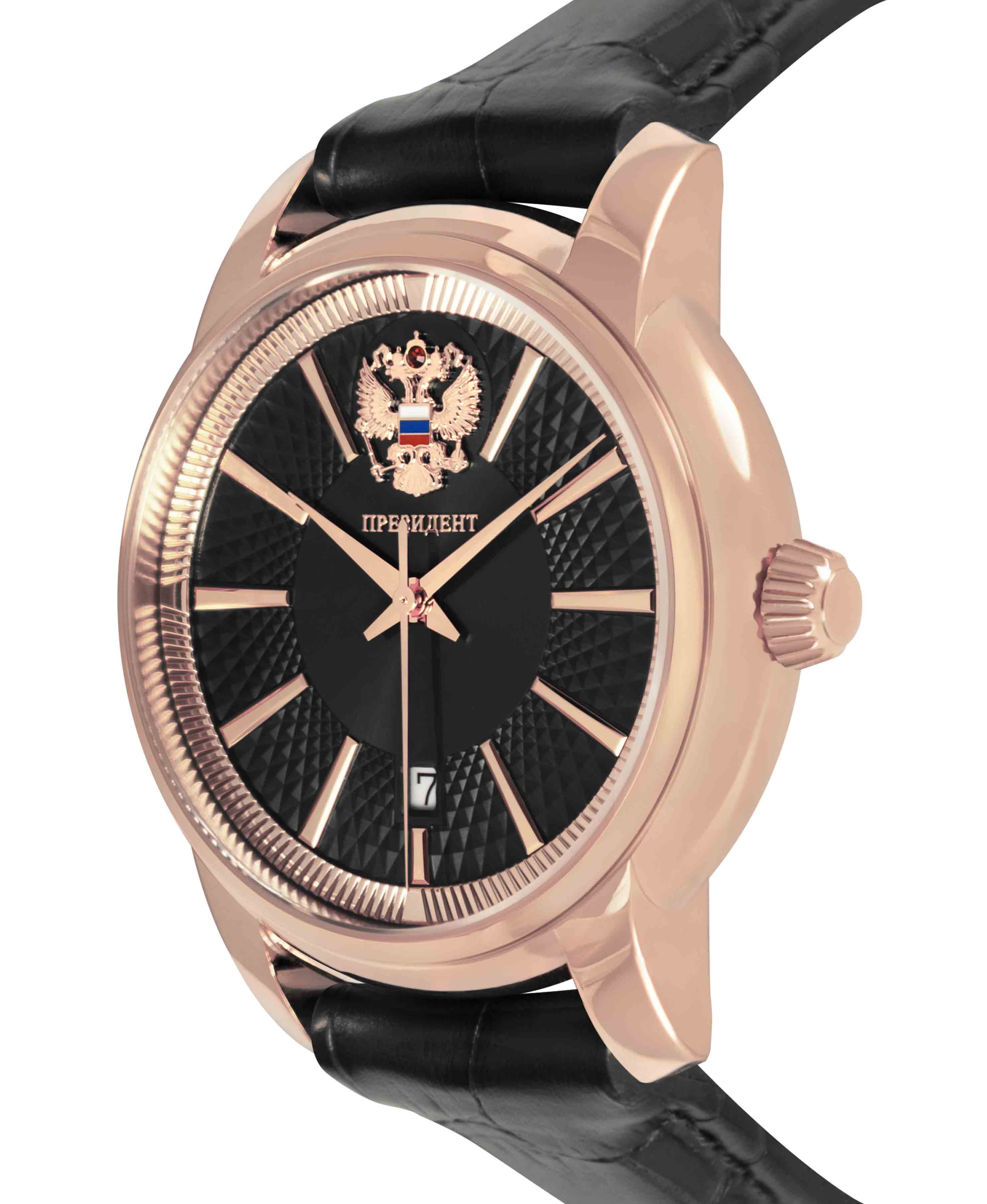 Мужские механические часы с автоподзаводом из коллекции Президент — это сочетание статусного дизайна и надёжного механизма. Корпус круглой формы выполнен в цвете розовое золото с PVD-покрытиемPVDУльтратонкое покрытие наносится в технике вакуумного напыления, сочетает в себе нитрид титана особой прочности со слоем золота или оксида хрома. Несёт в себе декоративную или защитную функцию. и защищён сапфировым стекломСапфировое стеклоПрочный и надёжный материал из кристалла сапфира синтетического происхождения, характеризующийся особой твёрдостью и устойчивостью к царапинам и повреждениям.. Циферблат украшен чеканкой Герба на задней крышке, контуром русской матрешки и инкрустацией кристаллами Swarovski, придающими модели уникальный вид. Часы оснащены кожаным ремешком, обеспечивающим комфорт при ношении. Механизм — механический с автоподзаводом, гарантирующий точное отсчёт времени. Водонепроницаемость 30 м позволяет использовать часы в повседневных условиях, защищая от случайных брызг и капель дождя. Комплектация включает подарочный футляр, паспорт с гарантийным талоном и фирменный пакет. Гарантия — 24 месяца.