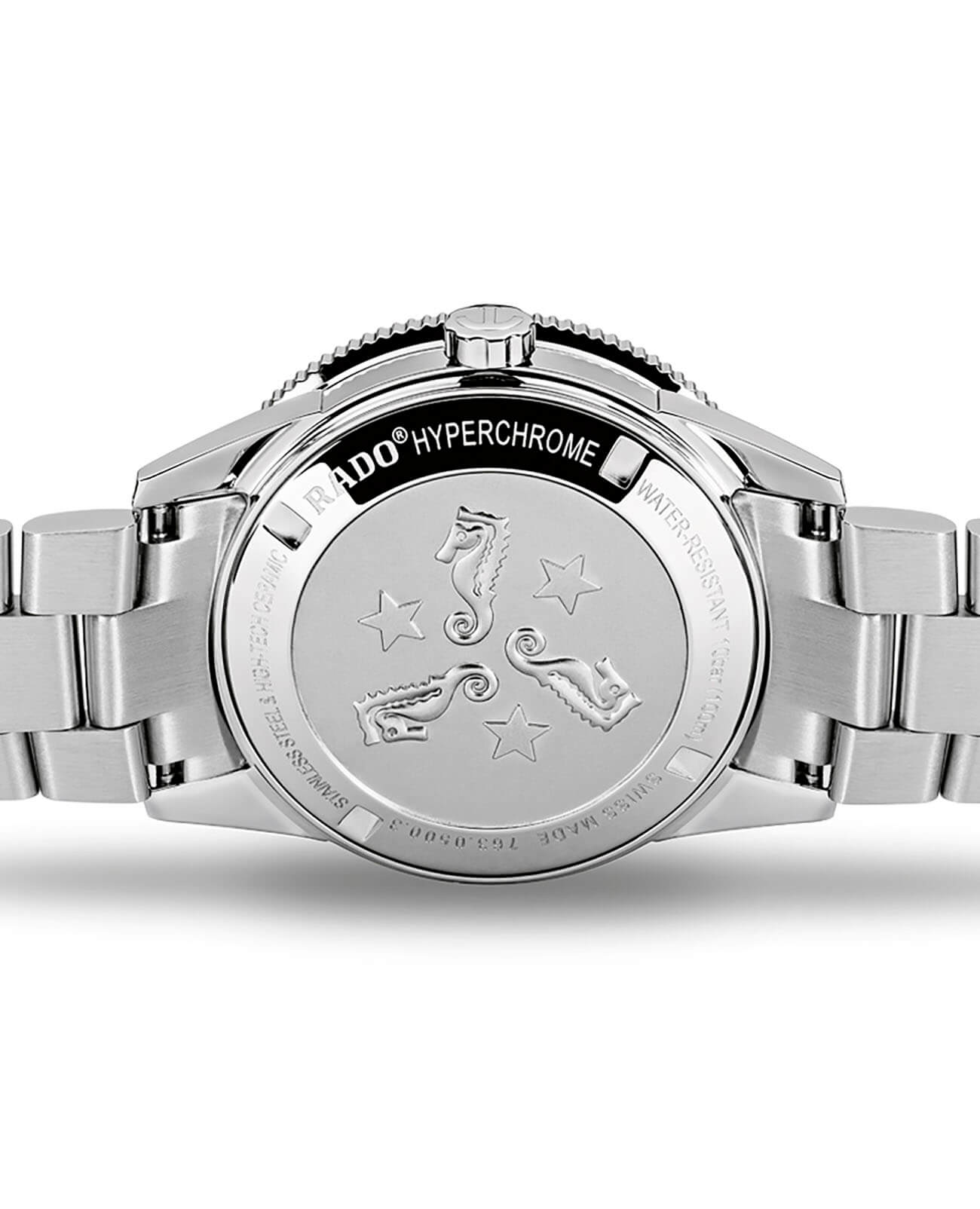 Брендовый аксессуар в серебристом исполнении дополнен винтажными деталями и оригинальными стрелками, выполненными в виде меча и стрелы. Премиальная модель с чёрным циферблатом идеальна для завершения образа солидного мужчины. Высокая точность хода обеспечивается за счёт швейцарского автоматического калибра ETA C07.611 с 80-часовым запасом хода. Завинчивающаяся задняя крышка. Антибликовое покрытие сапфирового стекла. Корпус и браслет из нержавеющей стали 316L, безельБезельВнешний ободок, закрепляющий стекло. В спортивных часах так называется поворотное кольцо с делениями на циферблате, выполняет роль таймера – замеряет отрезки времени на шкале. Неподвижный безель – элемент декора. Однонаправленно вращающийся безель на дайверских часах позволяет фиксировать моменты погружения и выныривания на поверхность. из высокотехнологичной керамикиВысокотехнологичная керамикаИнновационный запатентованный Rado материал с гладкой или матовой поверхностью. Керамика за счёт кристаллической структуры обладает повышенной устойчивостью от возникновения царапин. Материал способен принимать температуру тела человека, обеспечивая невероятный комфорт при ношении.. Водостойкость 200 метров. Люминесцентная подсветкаЛюминесцентное покрытиеПозволяет считывать показания времени в темноте. Производители наносят на стрелки, часовые индексы, безель или поверхность циферблата светонакопительный состав, дающий холодное свечение.. Отображение числа. Диаметр корпуса: 37,3 мм.