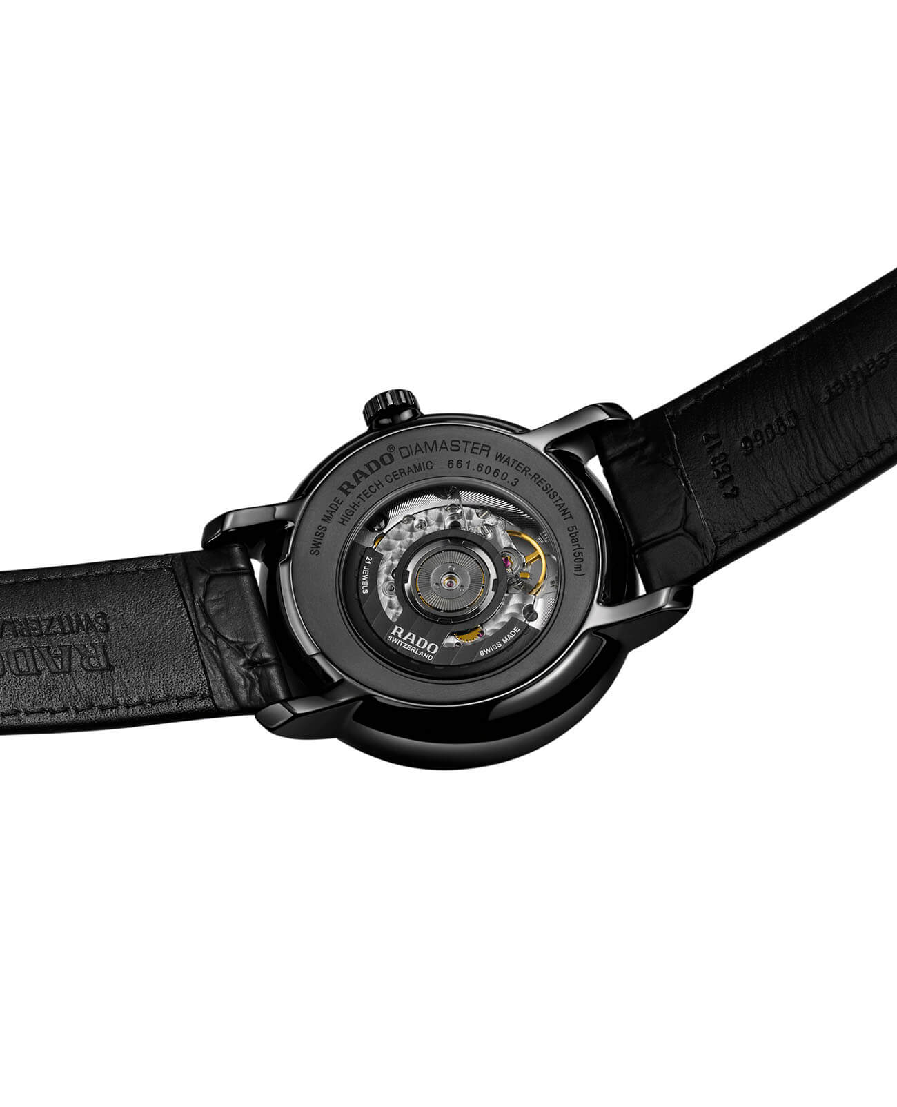 Оригинальный циферблат называют совершенством линий и лаконичности, необычное исполнение которого никого не оставляет равнодушным. Индикация времени занимает не всё пространство, секундный счётчик вынесен отдельно, серединка оставлена прозрачной. Наручные часы оснащаются автоматическим механизмом ETA 2899-S2 с запасом хода 42 часа, украшенным традиционным узором «женевские волны». Скелетонизированная задняя крышка. Антибликовое покрытие сапфирового стекла. Корпус и безельБезельВнешний ободок, закрепляющий стекло. В спортивных часах так называется поворотное кольцо с делениями на циферблате, выполняет роль таймера – замеряет отрезки времени на шкале. Неподвижный безель – элемент декора. Однонаправленно вращающийся безель на дайверских часах позволяет фиксировать моменты погружения и выныривания на поверхность. из высокотехнологичной керамикиВысокотехнологичная керамикаИнновационный запатентованный Rado материал с гладкой или матовой поверхностью. Керамика за счёт кристаллической структуры обладает повышенной устойчивостью от возникновения царапин. Материал способен принимать температуру тела человека, обеспечивая невероятный комфорт при ношении.. Ремешок из натуральной кожи. Апертура даты. Диаметр корпуса: 43 мм.