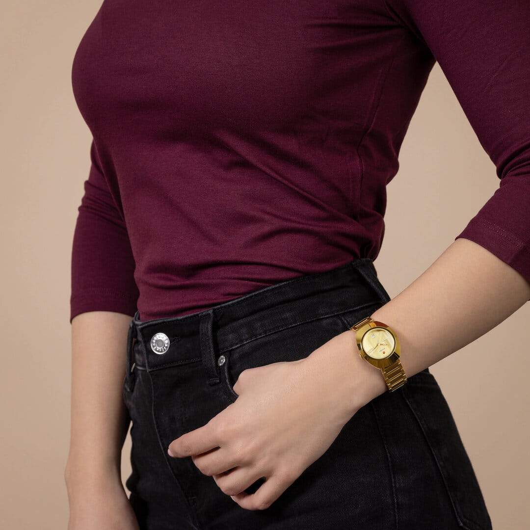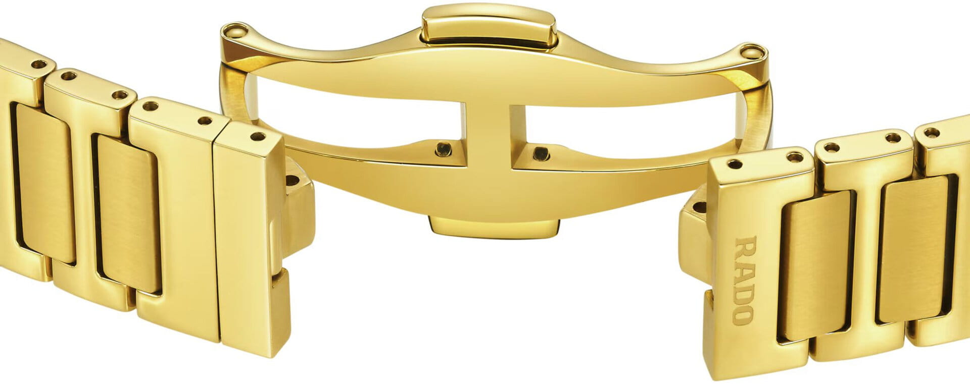 Женские механические часы с автоподзаводом Rado из коллекции Diastar Original — это элегантный аксессуар с классическим дизайном. Корпус овальной формы, диаметром 30 мм и толщиной 11 мм, выполнен из CeramosCeramosМатериал являет собой инновационное сочетание высокотехнологичной керамики и сплава металла. Он объединяет керамическую устойчивость к царапинам и металлический роскошный блеск. с PVD-покрытиемPVDУльтратонкое покрытие наносится в технике вакуумного напыления, сочетает в себе нитрид титана особой прочности со слоем золота или оксида хрома. Несёт в себе декоративную или защитную функцию. золотого цвета. Неподвижный безельБезельВнешний ободок, закрепляющий стекло. В спортивных часах так называется поворотное кольцо с делениями на циферблате, выполняет роль таймера – замеряет отрезки времени на шкале. Неподвижный безель – элемент декора. Однонаправленно вращающийся безель на дайверских часах позволяет фиксировать моменты погружения и выныривания на поверхность. также изготовлен из Ceramos. Циферблат жёлтого цвета оформлен без индексов, с золотистыми стрелками. Циферблат защищён сапфировым стекломСапфировое стеклоПрочный и надёжный материал из кристалла сапфира синтетического происхождения, характеризующийся особой твёрдостью и устойчивостью к царапинам и повреждениям. с антибликовым покрытиемАнтибликовое покрытиеСлой оксида металла в 0,13-0,3 микрон, благодаря которому стекло часов не бликует и не отражает свет. Антибликовое покрытие уменьшает отражение света в 10 раз, обеспечивая отличную читаемость показателей циферблата. на внутренней стороне. Стрелки с люминесцентным покрытиемЛюминесцентное покрытиеПозволяет считывать показания времени в темноте. Производители наносят на стрелки, часовые индексы, безель или поверхность циферблата светонакопительный состав, дающий холодное свечение. Super-Luminova®, обеспечивающим хорошую читаемость в темноте. Механизм — автоматический калибр R586 с запасом хода 48 часов, частотой 28 800 полуколебаний в час и 25 камнями. Окошко даты расположено в положении 6 часов. Часы оснащены стальным браслетом с застёжкой «бабочка» с кнопкамиЗастёжка "бабочка"Такой вид застёжки дополняется предохранителями, помогающими избежать случайного раскрытия браслета. Обладают изящным исполнением. . Водонепроницаемость 100 м позволяет использовать часы для плавания. Гарантия — 5 лет на механизм, 2 года на изделие. Идеальный выбор для тех, кто ценит стиль, точность и швейцарское качество.