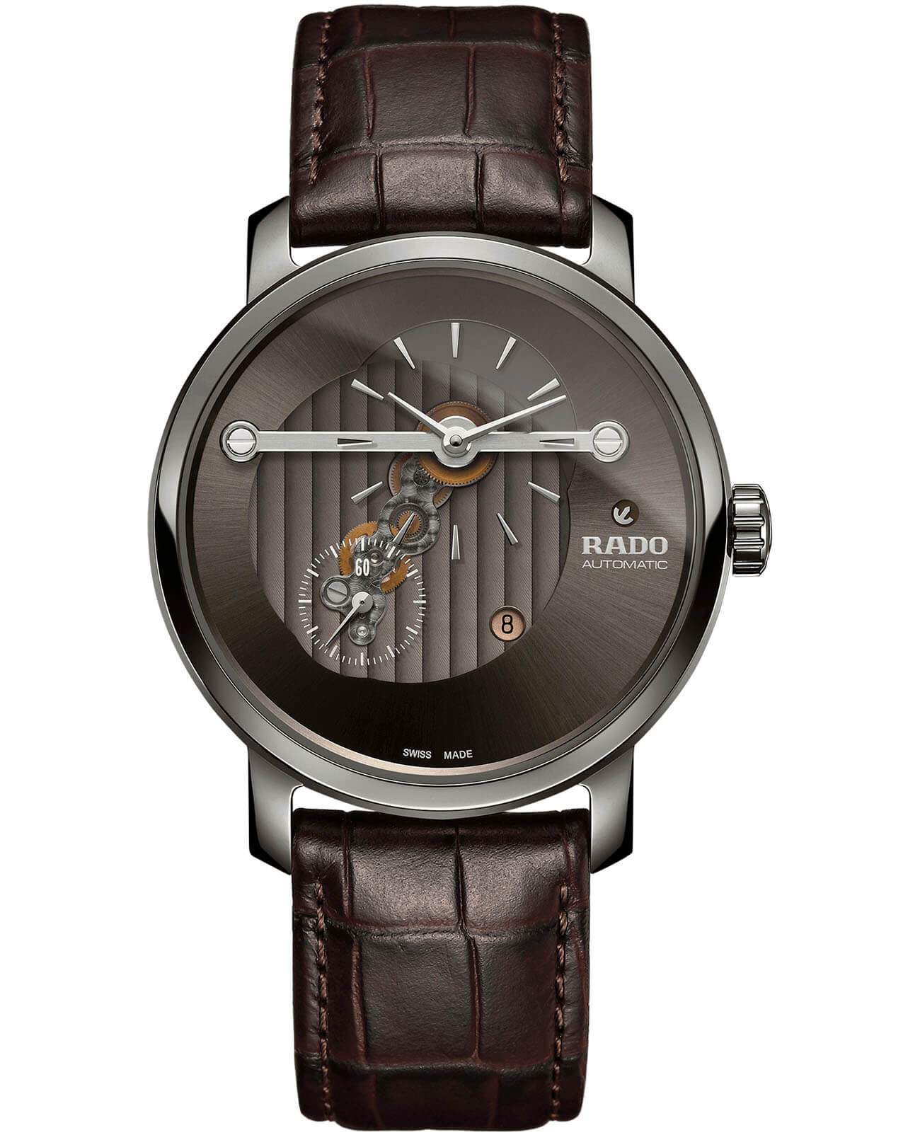 Оригинальный циферблат называют совершенством линий и лаконичности, необычное исполнение которого никого не оставляет равнодушным. Индикация времени занимает не всё пространство, секундный счётчик вынесен отдельно, серединка оставлена прозрачной. Наручные часы оснащаются автоматическим механизмом ETA 2899-S2 с запасом хода 42 часа, украшенным традиционным узором «женевские волны». Скелетонизированная задняя крышка. Антибликовое покрытие сапфирового стекла. Корпус и безельБезельВнешний ободок, закрепляющий стекло. В спортивных часах так называется поворотное кольцо с делениями на циферблате, выполняет роль таймера – замеряет отрезки времени на шкале. Неподвижный безель – элемент декора. Однонаправленно вращающийся безель на дайверских часах позволяет фиксировать моменты погружения и выныривания на поверхность. из плазменной керамикиВысокотехнологичная плазменная керамикаИнновационный материал, технология запатентована. Выплавление керамики осуществляется в печи при 20 000 °C, белоснежный материал под воздействием ультравысокой температуры приобретает уникальный блеск, присущий металлам.. Коричневый ремешок из натуральной кожи. Апертура даты. Диаметр корпуса: 43 мм.
