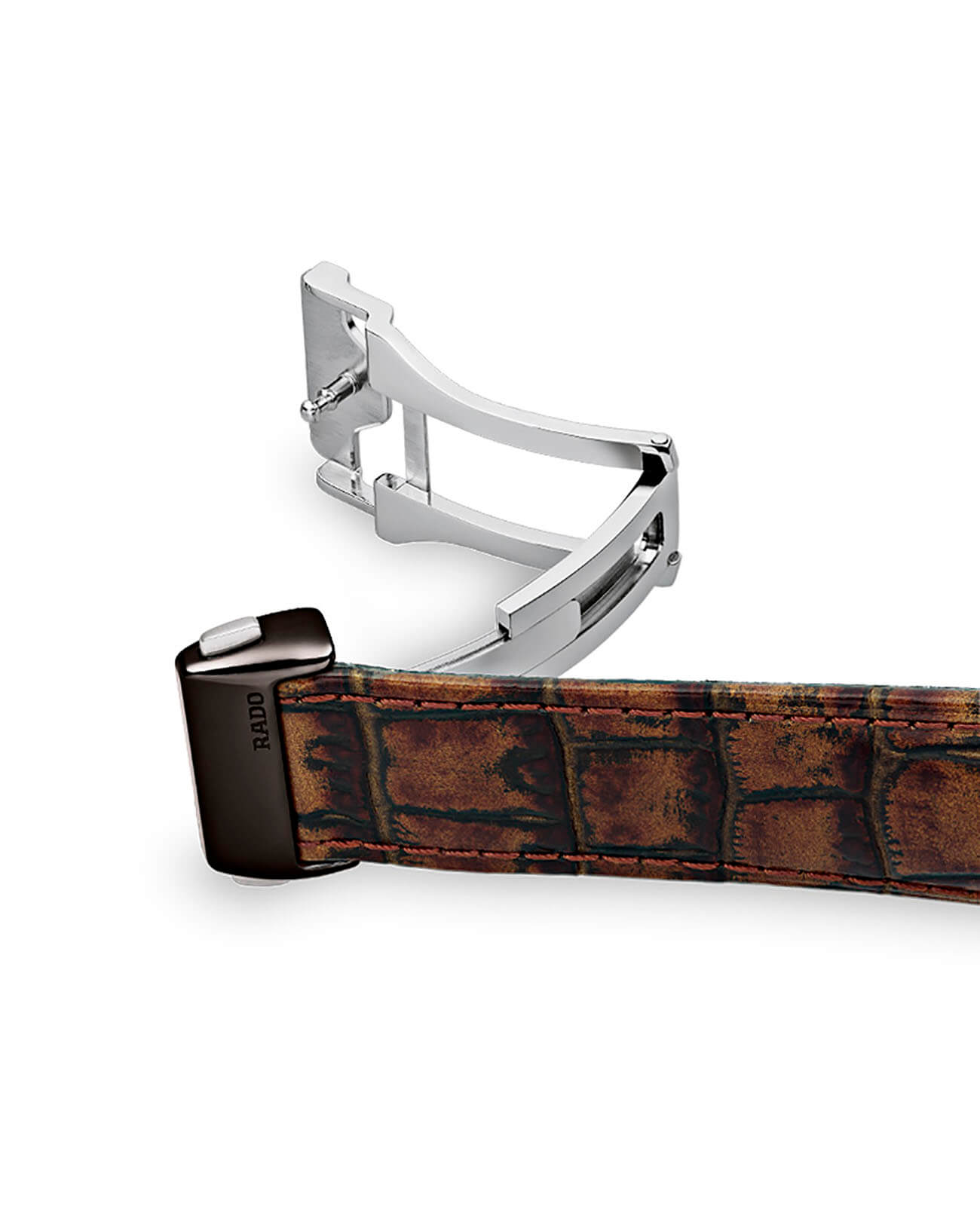 Классический ремешок из натуральной кожи выгодно гармонирует с оригинальным циферблатом, сквозь прозрачное окошко которого можно рассмотреть движение деталей автоматического механизма. Необычно смотрится миниатюрная индикация времени и отдельный секундный счётчик. Высокую точность хода обеспечивает калибр ETA 2899-S2 с запасом хода 42 часа, имеющим узор «женевские волны». Прозрачная задняя крышка. Стекло из сапфира с антибликовым покрытием. Корпус и безельБезельВнешний ободок, закрепляющий стекло. В спортивных часах так называется поворотное кольцо с делениями на циферблате, выполняет роль таймера – замеряет отрезки времени на шкале. Неподвижный безель – элемент декора. Однонаправленно вращающийся безель на дайверских часах позволяет фиксировать моменты погружения и выныривания на поверхность. из высокотехнологичной плазменной керамикиВысокотехнологичная плазменная керамикаИнновационный материал, технология запатентована. Выплавление керамики осуществляется в печи при 20 000 °C, белоснежный материал под воздействием ультравысокой температуры приобретает уникальный блеск, присущий металлам.. Водостойкость до 5 бар. Апертура даты. Диаметр корпуса: 43 мм.