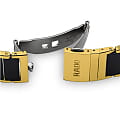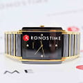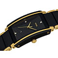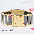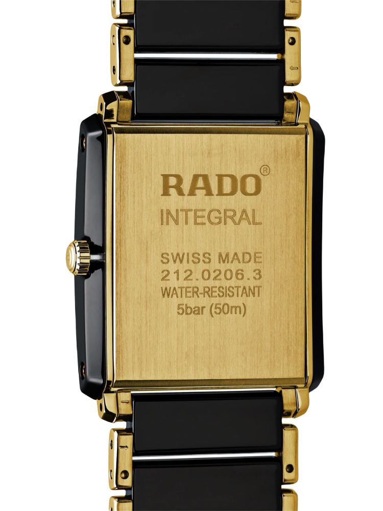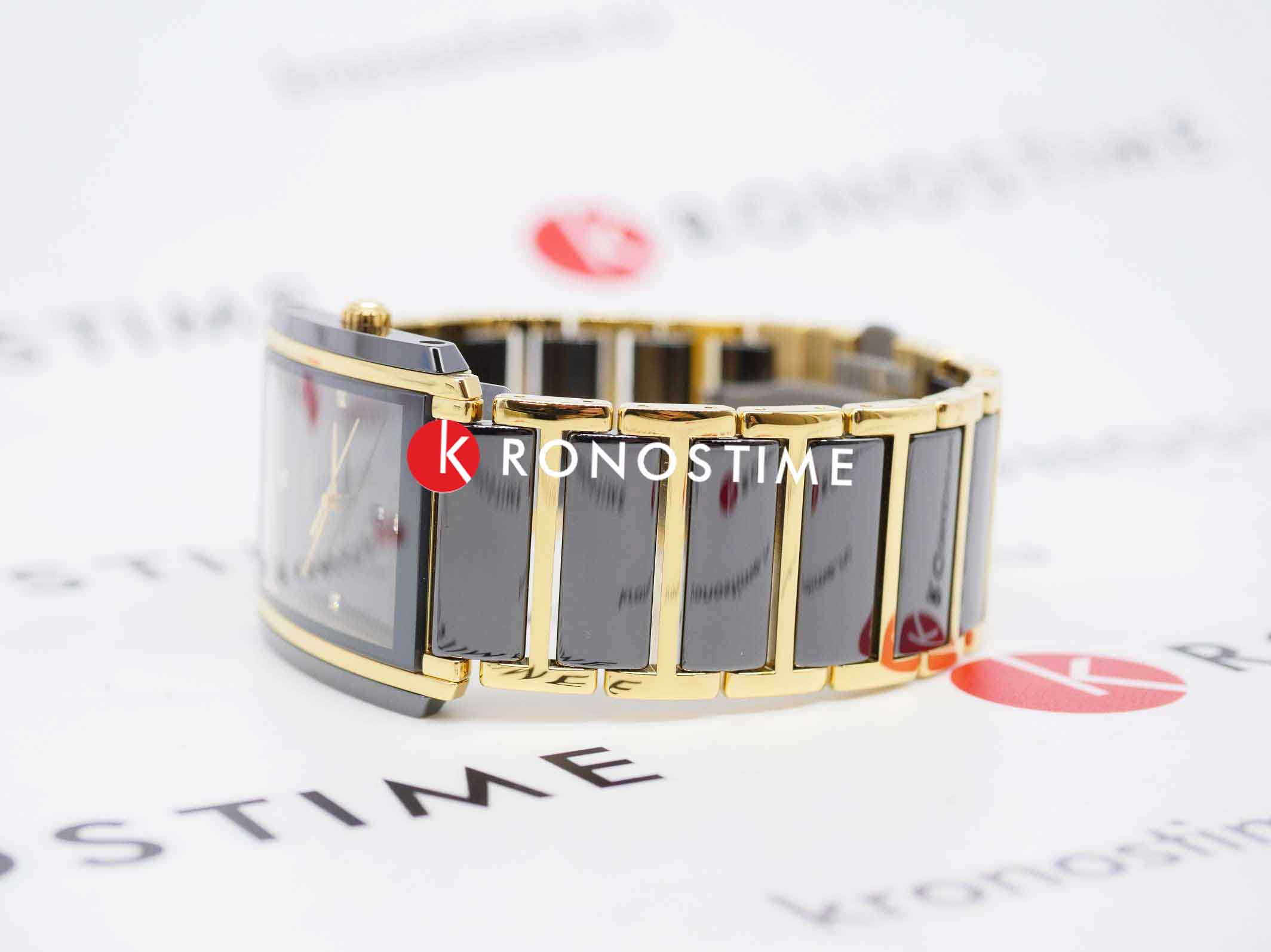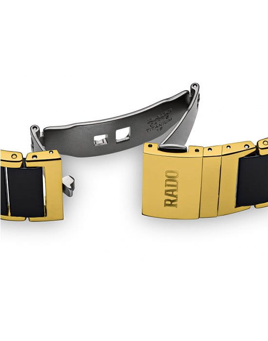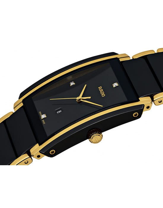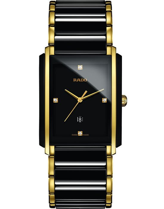 Наручные часы привлекают строгими геометрическими формами, элегантным стилем, оригинальным дизайном. Прямоугольный чёрный циферблат декорирован 4 бриллиантами в 0,032 карат, сияние драгоценных камней добавит образу роскоши. Стальной браслет дополнен вставками из высокотехнологичной керамикиВысокотехнологичная керамикаИнновационный запатентованный Rado материал с гладкой или матовой поверхностью. Керамика за счёт кристаллической структуры обладает повышенной устойчивостью от возникновения царапин. Материал способен принимать температуру тела человека, обеспечивая невероятный комфорт при ношении.. Кварцевый механизм ETA E61.111. Надёжное сапфировое стекло. . Золотистое PVD-покрытиеPVDУльтратонкое покрытие наносится в технике вакуумного напыления, сочетает в себе нитрид титана особой прочности со слоем золота или оксида хрома. Несёт в себе декоративную или защитную функцию.. Отображение даты. Габариты: 31 x 41,1 x 7,6 мм.