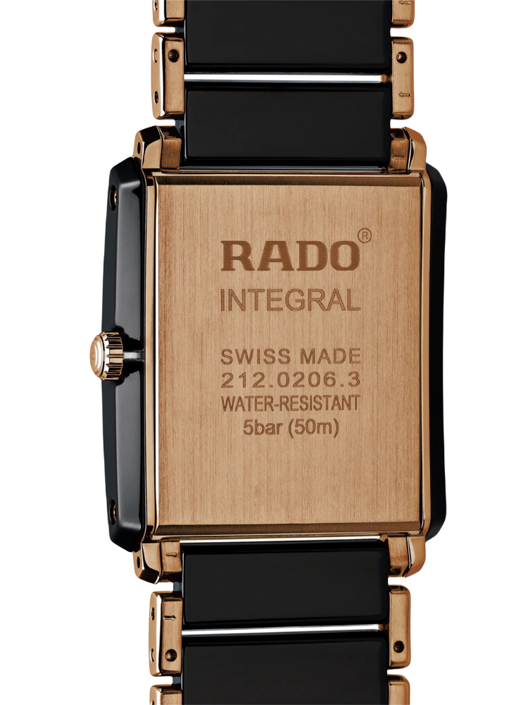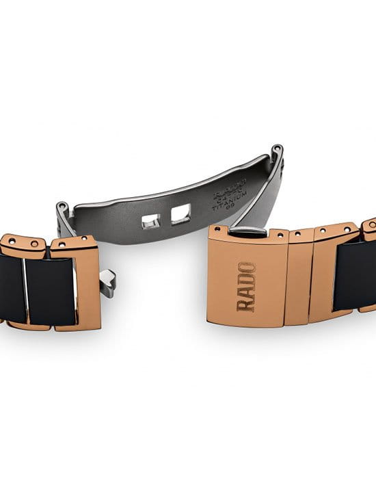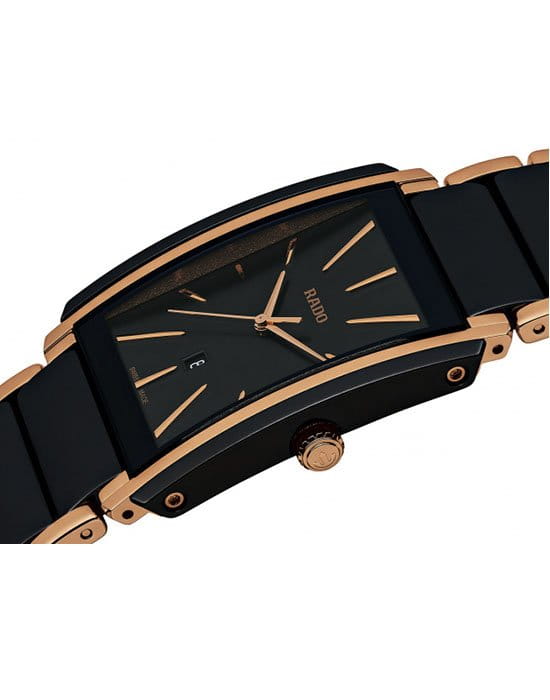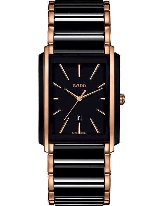 Наручные часы привлекают чёткими геометрическими формами, стильный прямоугольный циферблат с удлинёнными индексами точно оценят любители классики и элегантности. Модель выполнена из нержавеющей стали со вставками из высокотехнологичной керамикиВысокотехнологичная керамикаИнновационный запатентованный Rado материал с гладкой или матовой поверхностью. Керамика за счёт кристаллической структуры обладает повышенной устойчивостью от возникновения царапин. Материал способен принимать температуру тела человека, обеспечивая невероятный комфорт при ношении.. За высокую точность хода отвечает кварцевый калибр ETA E61.111. Стекло из сапфира. PVD-покрытиеPVDУльтратонкое покрытие наносится в технике вакуумного напыления, сочетает в себе нитрид титана особой прочности со слоем золота или оксида хрома. Несёт в себе декоративную или защитную функцию. цвета розовое золото. Апертура даты. Габариты: 31 x 41,1 x 7,5 мм.