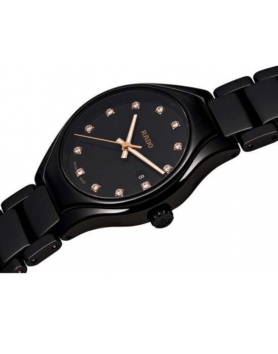 Часы станут элегантным выражением вашей женственной и романтичной натуры. Чёрный циферблат выполнен в стиле минимализм, роскошным элементом являются 12 бриллиантов в 0,096 карат. Для изготовления корпуса и браслета была выбрана высокотехнологичная керамикаВысокотехнологичная керамикаИнновационный запатентованный Rado материал с гладкой или матовой поверхностью. Керамика за счёт кристаллической структуры обладает повышенной устойчивостью от возникновения царапин. Материал способен принимать температуру тела человека, обеспечивая невероятный комфорт при ношении. с оригинальным металлическим отблеском. Швейцарский кварцевый механизм ETA 956.112. Стекло из сапфира. Стрелки с люминесцентной подсветкойЛюминесцентное покрытиеПозволяет считывать показания времени в темноте. Производители наносят на стрелки, часовые индексы, безель или поверхность циферблата светонакопительный состав, дающий холодное свечение.. Водонепроницаемость 50 метров. . Отображение числа. Диаметр корпуса: 30 мм.