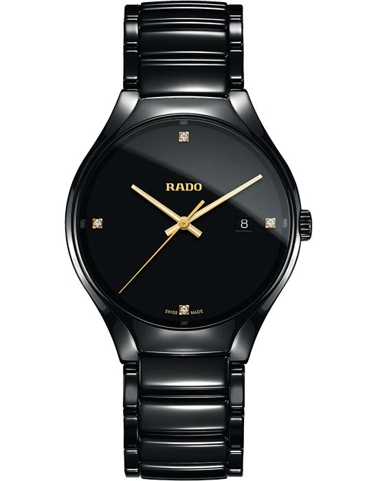 Глянцевый корпус представлен в оригинальном дизайне, его линии плавно перетекают в браслет. Наручные часы выполнены из высокотехнологичной керамикиВысокотехнологичная керамикаИнновационный запатентованный Rado материал с гладкой или матовой поверхностью. Керамика за счёт кристаллической структуры обладает повышенной устойчивостью от возникновения царапин. Материал способен принимать температуру тела человека, обеспечивая невероятный комфорт при ношении., материал не вызывает аллергии и обеспечивает невероятный комфорт при ношении. Минималистичный циферблат инкрустирован 4 бриллиантами в 0,040 карат. Швейцарский кварцевый калибр ETA 955.112. Сапфировое стекло устойчиво к образованию царапин. Золотистые стрелки с люминесцентной подсветкойЛюминесцентное покрытиеПозволяет считывать показания времени в темноте. Производители наносят на стрелки, часовые индексы, безель или поверхность циферблата светонакопительный состав, дающий холодное свечение.. Водостойкость 5 бар. . Отображение даты. Диаметр корпуса: 40 мм.