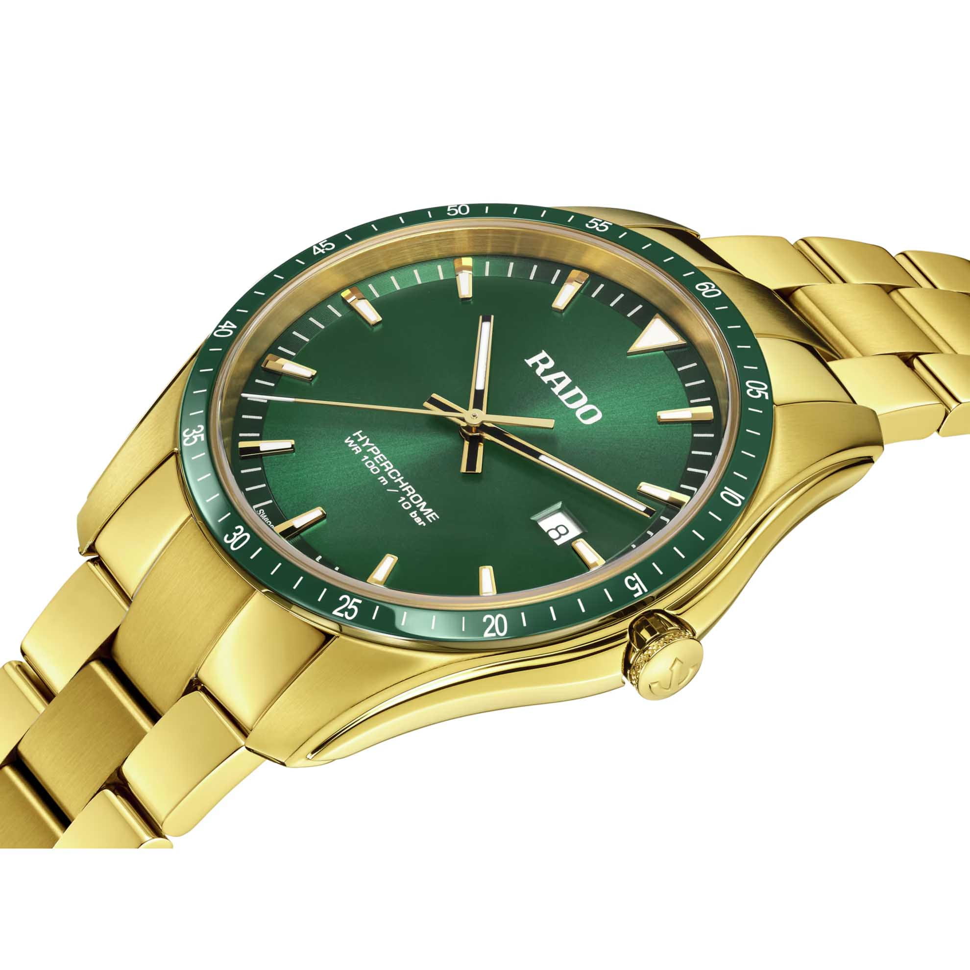 Мужские кварцевые часы Rado HyperChrome — это стильный и современный аксессуар с динамичным дизайном. Корпус диаметром 44,9 мм и толщиной 10,1 мм выполнен из нержавеющей стали с PVD-покрытиемPVDУльтратонкое покрытие наносится в технике вакуумного напыления, сочетает в себе нитрид титана особой прочности со слоем золота или оксида хрома. Несёт в себе декоративную или защитную функцию.. БезельБезельВнешний ободок, закрепляющий стекло. В спортивных часах так называется поворотное кольцо с делениями на циферблате, выполняет роль таймера – замеряет отрезки времени на шкале. Неподвижный безель – элемент декора. Однонаправленно вращающийся безель на дайверских часах позволяет фиксировать моменты погружения и выныривания на поверхность. изготовлен из высокотехнологичной керамикиВысокотехнологичная керамикаИнновационный запатентованный Rado материал с гладкой или матовой поверхностью. Керамика за счёт кристаллической структуры обладает повышенной устойчивостью от возникновения царапин. Материал способен принимать температуру тела человека, обеспечивая невероятный комфорт при ношении. зелёного цвета, придающей часам изысканность и устойчивость к царапинам. Циферблат оформлен индексами и стрелками с люминесцентным покрытиемЛюминесцентное покрытиеПозволяет считывать показания времени в темноте. Производители наносят на стрелки, часовые индексы, безель или поверхность циферблата светонакопительный состав, дающий холодное свечение. Super-Luminova®, обеспечивающим хорошую читаемость в темноте. Механизм — кварцевый калибр R073. Часы оснащены браслетом из нержавеющей стали с PVD-покрытиемPVDУльтратонкое покрытие наносится в технике вакуумного напыления, сочетает в себе нитрид титана особой прочности со слоем золота или оксида хрома. Несёт в себе декоративную или защитную функцию. на застёжке «бабочка» с кнопкамиЗастёжка "бабочка"Такой вид застёжки дополняется предохранителями, помогающими избежать случайного раскрытия браслета. Обладают изящным исполнением. . Универсальный выбор для тех, кто ценит элегантность, надёжность и современный стиль.