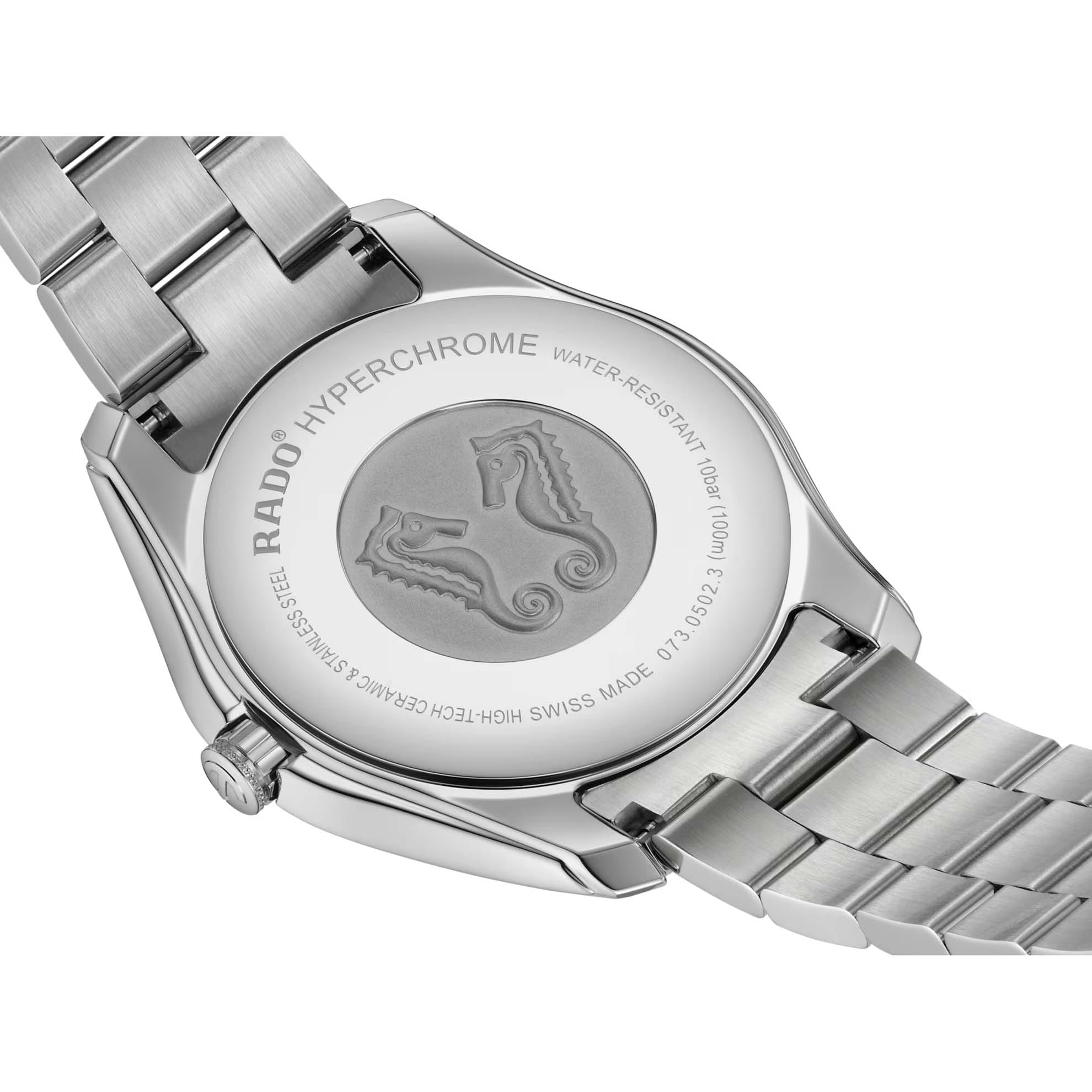 Мужские кварцевые часы Rado HyperChrome — это стильный и современный аксессуар с динамичным дизайном. Корпус диаметром 44,9 мм и толщиной 10,1 мм выполнен из нержавеющей стали. БезельБезельВнешний ободок, закрепляющий стекло. В спортивных часах так называется поворотное кольцо с делениями на циферблате, выполняет роль таймера – замеряет отрезки времени на шкале. Неподвижный безель – элемент декора. Однонаправленно вращающийся безель на дайверских часах позволяет фиксировать моменты погружения и выныривания на поверхность. изготовлен из высокотехнологичной керамикиВысокотехнологичная керамикаИнновационный запатентованный Rado материал с гладкой или матовой поверхностью. Керамика за счёт кристаллической структуры обладает повышенной устойчивостью от возникновения царапин. Материал способен принимать температуру тела человека, обеспечивая невероятный комфорт при ношении. чёрного цвета, придающей часам изысканность и устойчивость к царапинам. Циферблат оформлен индексами и стрелками с люминесцентным покрытиемЛюминесцентное покрытиеПозволяет считывать показания времени в темноте. Производители наносят на стрелки, часовые индексы, безель или поверхность циферблата светонакопительный состав, дающий холодное свечение. Super-Luminova®, обеспечивающим хорошую читаемость в темноте. Механизм — кварцевый калибр R073. Часы оснащены браслетом из нержавеющей стали с застёжкой «бабочка» с кнопкамиЗастёжка "бабочка"Такой вид застёжки дополняется предохранителями, помогающими избежать случайного раскрытия браслета. Обладают изящным исполнением. . Универсальный выбор для тех, кто ценит элегантность, надёжность и современный стиль.