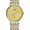 Универсальные механические часы с автоподзаводом Rado из коллекции Florence — это воплощение швейцарской точности и элегантности. Корпус диаметром 39 мм и толщиной 11 мм выполнен из нержавеющей стали. Циферблат золотистого цвета с рельефным узором оформлен накладными индексами и подвижным якорем бренда — символом Rado. Циферблат защищён сапфировым стекломСапфировое стеклоПрочный и надёжный материал из кристалла сапфира синтетического происхождения, характеризующийся особой твёрдостью и устойчивостью к царапинам и повреждениям. с антибликовым покрытиемАнтибликовое покрытиеСлой оксида металла в 0,13-0,3 микрон, благодаря которому стекло часов не бликует и не отражает свет. Антибликовое покрытие уменьшает отражение света в 10 раз, обеспечивая отличную читаемость показателей циферблата., которое одновременно выполняет функцию безеляБезельВнешний ободок, закрепляющий стекло. В спортивных часах так называется поворотное кольцо с делениями на циферблате, выполняет роль таймера – замеряет отрезки времени на шкале. Неподвижный безель – элемент декора. Однонаправленно вращающийся безель на дайверских часах позволяет фиксировать моменты погружения и выныривания на поверхность. с PVD-покрытиемPVDУльтратонкое покрытие наносится в технике вакуумного напыления, сочетает в себе нитрид титана особой прочности со слоем золота или оксида хрома. Несёт в себе декоративную или защитную функцию. жёлтого золота. Механизм — автоматический калибр R763 с пружиной Nivachron™Nivachron™Специально разработанный инновационный сплав Nivachron™ повышает устойчивость часов к воздействию магнитных полей., отрегулированный в пяти положениях, с запасом хода 80 часов. Окошко даты расположено в положении 3 часов. Прозрачная задняя крышка с сапфировым стеклом позволяет наблюдать за работой механизма. Завинчивающаяся коронка обеспечивает дополнительную защиту. Часы оснащены двухцветным стальным браслетом с PVD-покрытиемPVDУльтратонкое покрытие наносится в технике вакуумного напыления, сочетает в себе нитрид титана особой прочности со слоем золота или оксида хрома. Несёт в себе декоративную или защитную функцию. жёлтого золота и трёхсекционной застёжкой из нержавеющей стали. Водонепроницаемость 50 м позволяет использовать часы в повседневных условиях. Идеальный выбор для тех, кто ценит мастерство, стиль и универсальность.