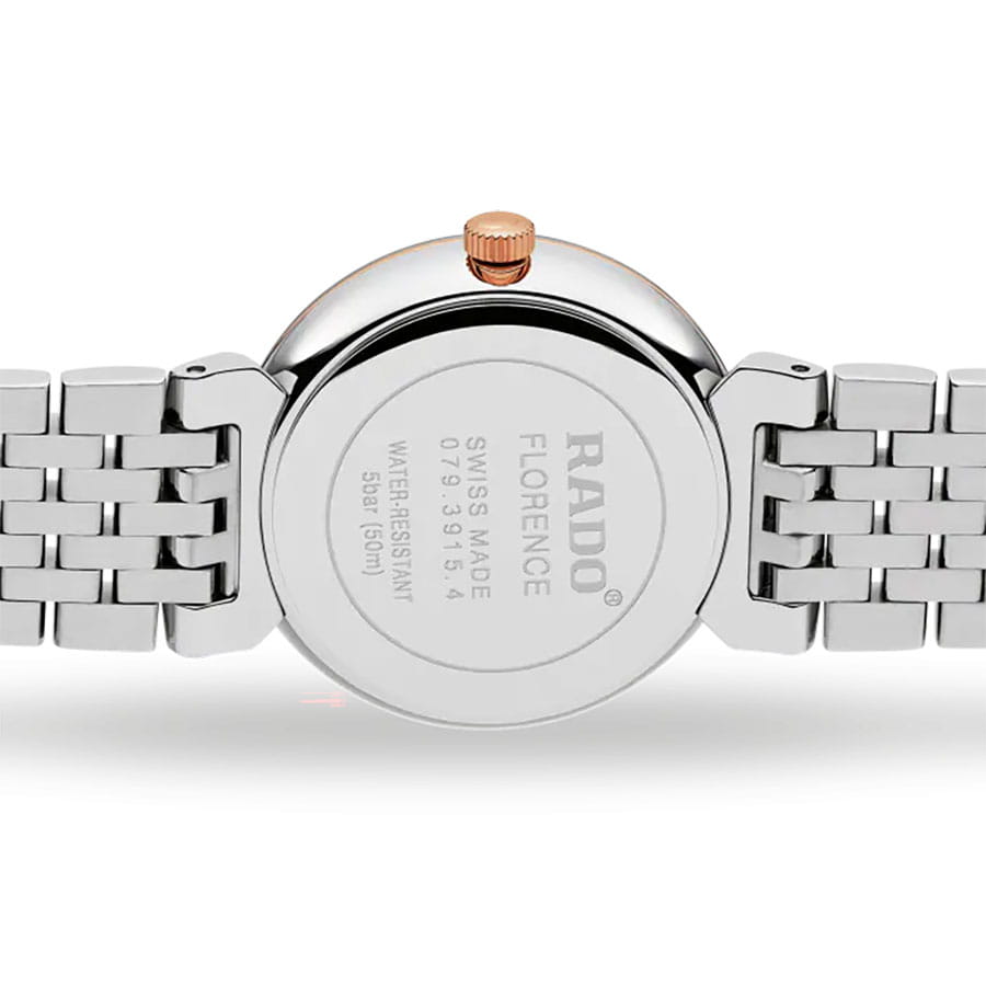 Швейцарские часы Rado Florence Classic Diamonds R48913723, кварцевый механизм с высокой точностью. Сапфировое стеклоСапфировое стеклоПрочный и надёжный материал из кристалла сапфира синтетического происхождения, характеризующийся особой твёрдостью и устойчивостью к царапинам и повреждениям. устойчивое к мелким механическим повреждениям. Корпус часов изготовлен из нержавеющей стали с PVD-покрытиемPVDУльтратонкое покрытие наносится в технике вакуумного напыления, сочетает в себе нитрид титана особой прочности со слоем золота или оксида хрома. Несёт в себе декоративную или защитную функцию.. Циферблат украшен бриллиантами. Класс водозащиты: 50 метров, позволит защитить корпус от случайных брызг или капель дождя. Браслет из нержавеющей стали с частичным PVD-покрытиемPVDУльтратонкое покрытие наносится в технике вакуумного напыления, сочетает в себе нитрид титана особой прочности со слоем золота или оксида хрома. Несёт в себе декоративную или защитную функцию. на застёжке-бабочкеЗастёжка "бабочка"Такой вид застёжки дополняется предохранителями, помогающими избежать случайного раскрытия браслета. Обладают изящным исполнением. .