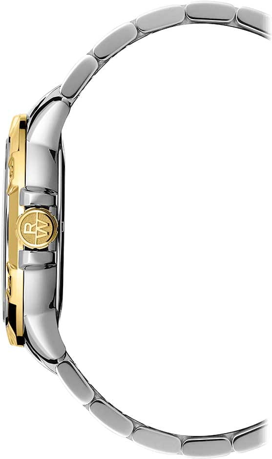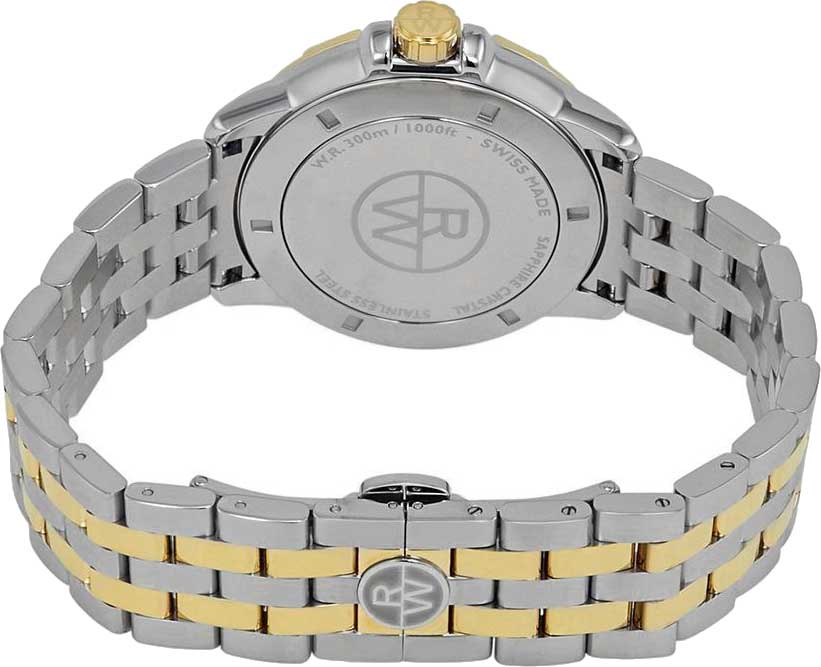 Модель оснащена фирменным безелемБезельВнешний ободок, закрепляющий стекло. В спортивных часах так называется поворотное кольцо с делениями на циферблате, выполняет роль таймера – замеряет отрезки времени на шкале. Неподвижный безель – элемент декора. Однонаправленно вращающийся безель на дайверских часах позволяет фиксировать моменты погружения и выныривания на поверхность. с шестью декоративными винтами и завинчивающейся заводной головкой с защитой и логотипом RW. Завинчивающаяся задняя крышка и стальной браслет с PVD-покрытиемPVDУльтратонкое покрытие наносится в технике вакуумного напыления, сочетает в себе нитрид титана особой прочности со слоем золота или оксида хрома. Несёт в себе декоративную или защитную функцию. на раскладной застёжкеРаскладная застёжкаТакой тип застёжки используется только на браслетах из металла. Она никогда не раскрывается полностью, происходит разделение на 2 и более частей. Раскладывающая застёжка снизит вероятность потери часов к минимуму. с двойной системой защиты добавляет уверенности в использовании.