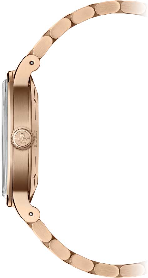Прозрачная задняя крышка с сапфировым стекломСапфировое стеклоПрочный и надёжный материал из кристалла сапфира синтетического происхождения, характеризующийся особой твёрдостью и устойчивостью к царапинам и повреждениям.. Рифленая заводная головка с логотипом RW.