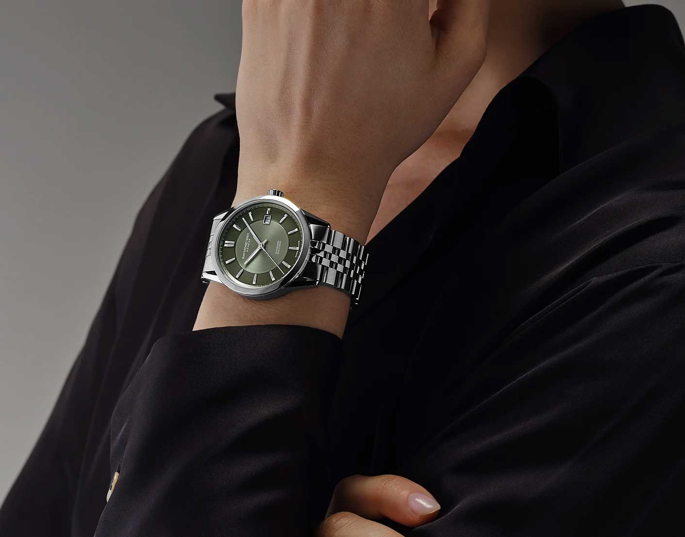 Часы Raymond Weil Freelancer 2771-ST-52051 — это элегантный аксессуар, сочетающий швейцарское качество и современный дизайн. Корпус диаметром 38 мм выполнен из нержавеющей стали, что придаёт часам стильный и долговечный вид. Зеленый циферблат с солнечным узором оснащён стрелками и часовыми метками с люминесцентным покрытиемЛюминесцентное покрытиеПозволяет считывать показания времени в темноте. Производители наносят на стрелки, часовые индексы, безель или поверхность циферблата светонакопительный состав, дающий холодное свечение., что обеспечивает отличную читаемость в любых условиях освещения. Окно даты на отметке 3 часа добавляет удобства в повседневной жизни.