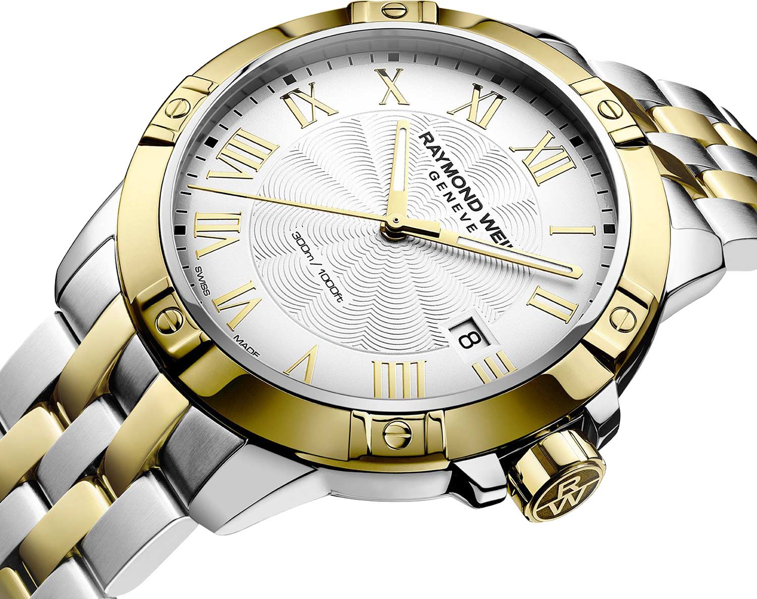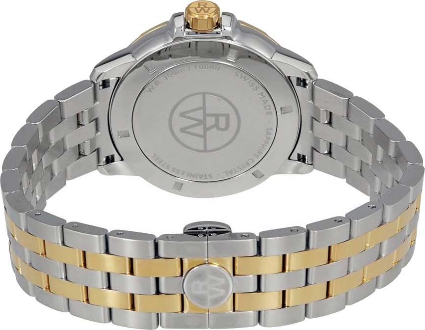 Модель оснащена фирменным безелемБезельВнешний ободок, закрепляющий стекло. В спортивных часах так называется поворотное кольцо с делениями на циферблате, выполняет роль таймера – замеряет отрезки времени на шкале. Неподвижный безель – элемент декора. Однонаправленно вращающийся безель на дайверских часах позволяет фиксировать моменты погружения и выныривания на поверхность. с шестью декоративными винтами и завинчивающейся заводной головкой с защитой и логотипом RW. Завинчивающаяся задняя крышка и стальной браслет на раскладной застёжкеРаскладная застёжкаТакой тип застёжки используется только на браслетах из металла. Она никогда не раскрывается полностью, происходит разделение на 2 и более частей. Раскладывающая застёжка снизит вероятность потери часов к минимуму. с двойной системой защиты добавляет уверенности в использовании.