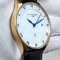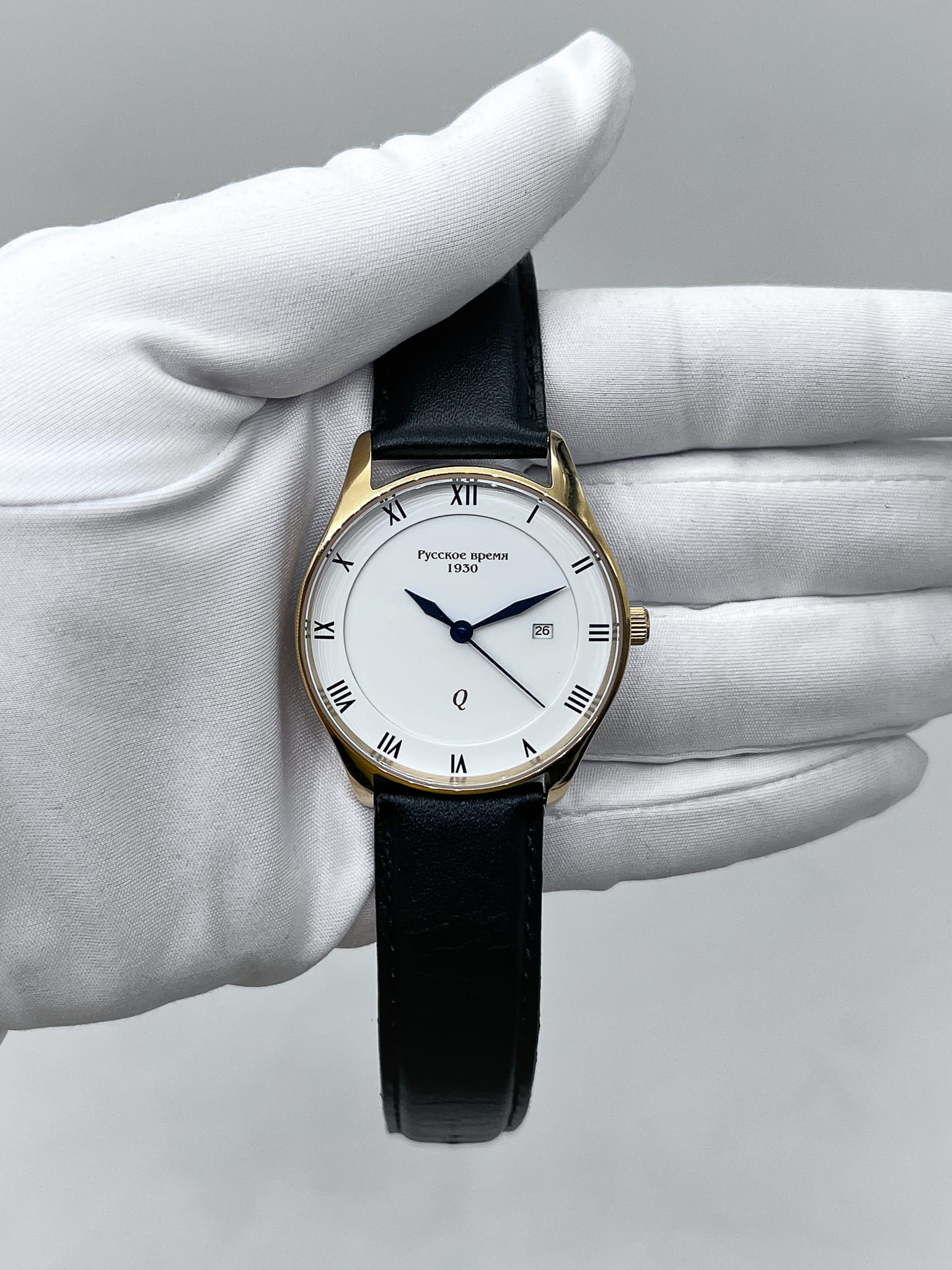 Стальной корпус круглой формы диаметром 38.2 мм и толщиной 9.2 мм выполнен из нержавеющей стали с частичным золотистым покрытием, что придает часам элегантный и премиальный вид. Циферблат белого цвета с римскими цифрами и метками в виде штрихов надежно защищен закаленным минеральным стекломМинеральное стеклоМинеральное стекло представляет собой искусственно выращенный минерал кварца. Такое стекло отличается особой устойчивостью к повреждениям и царапинам. Уступает по некоторым качествам сапфировому стеклу., что предотвращает появление царапин и повреждений.