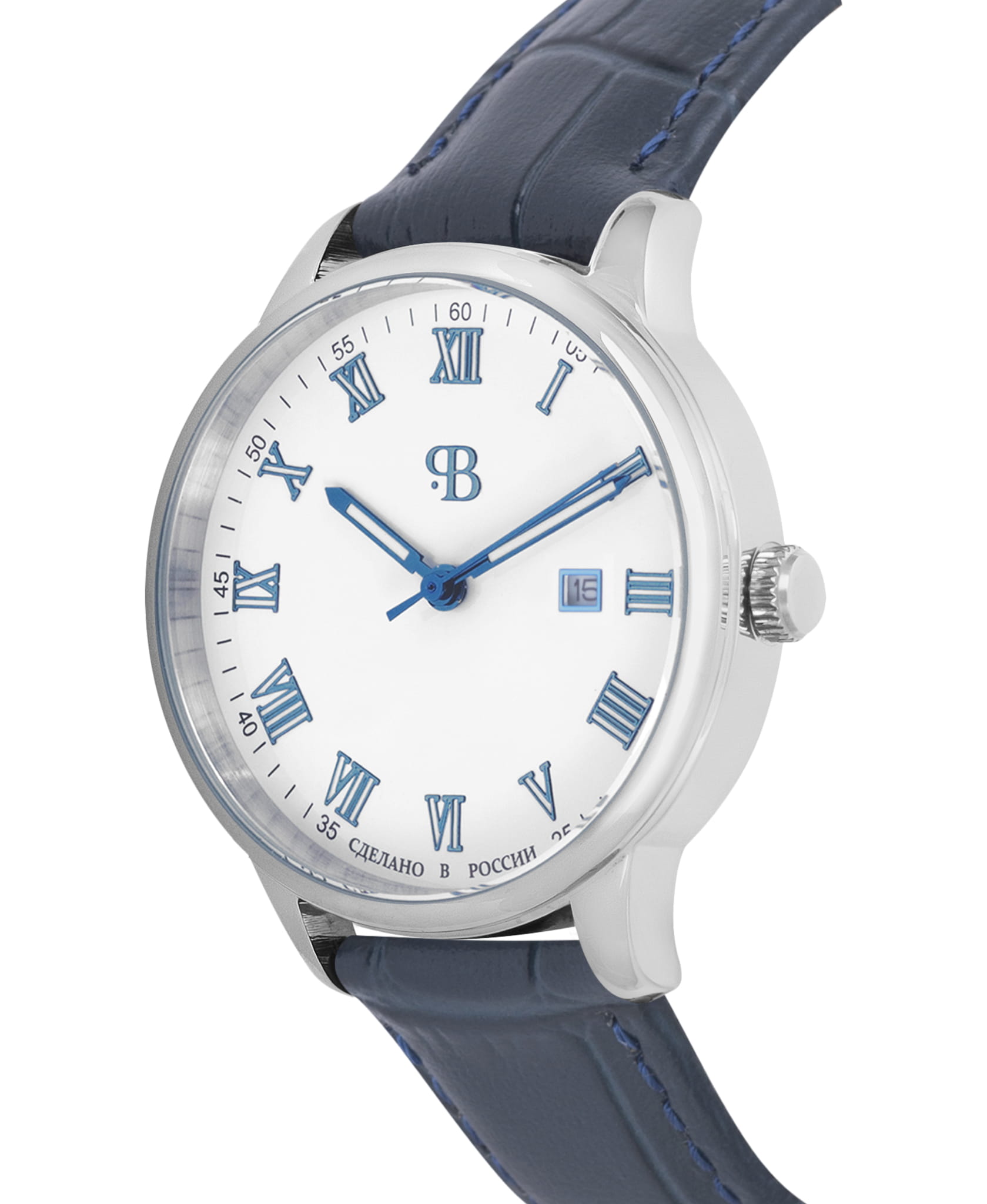 Стальной корпус круглой формы диаметром 42 мм и толщиной 10.1 мм выполнен из нержавеющей стали, что придает часам прочность и долговечность. Циферблат белого цвета с римскими цифрами и метками в виде штрихов надежно защищен закаленным минеральным стекломМинеральное стеклоМинеральное стекло представляет собой искусственно выращенный минерал кварца. Такое стекло отличается особой устойчивостью к повреждениям и царапинам. Уступает по некоторым качествам сапфировому стеклу., что предотвращает появление царапин и повреждений.