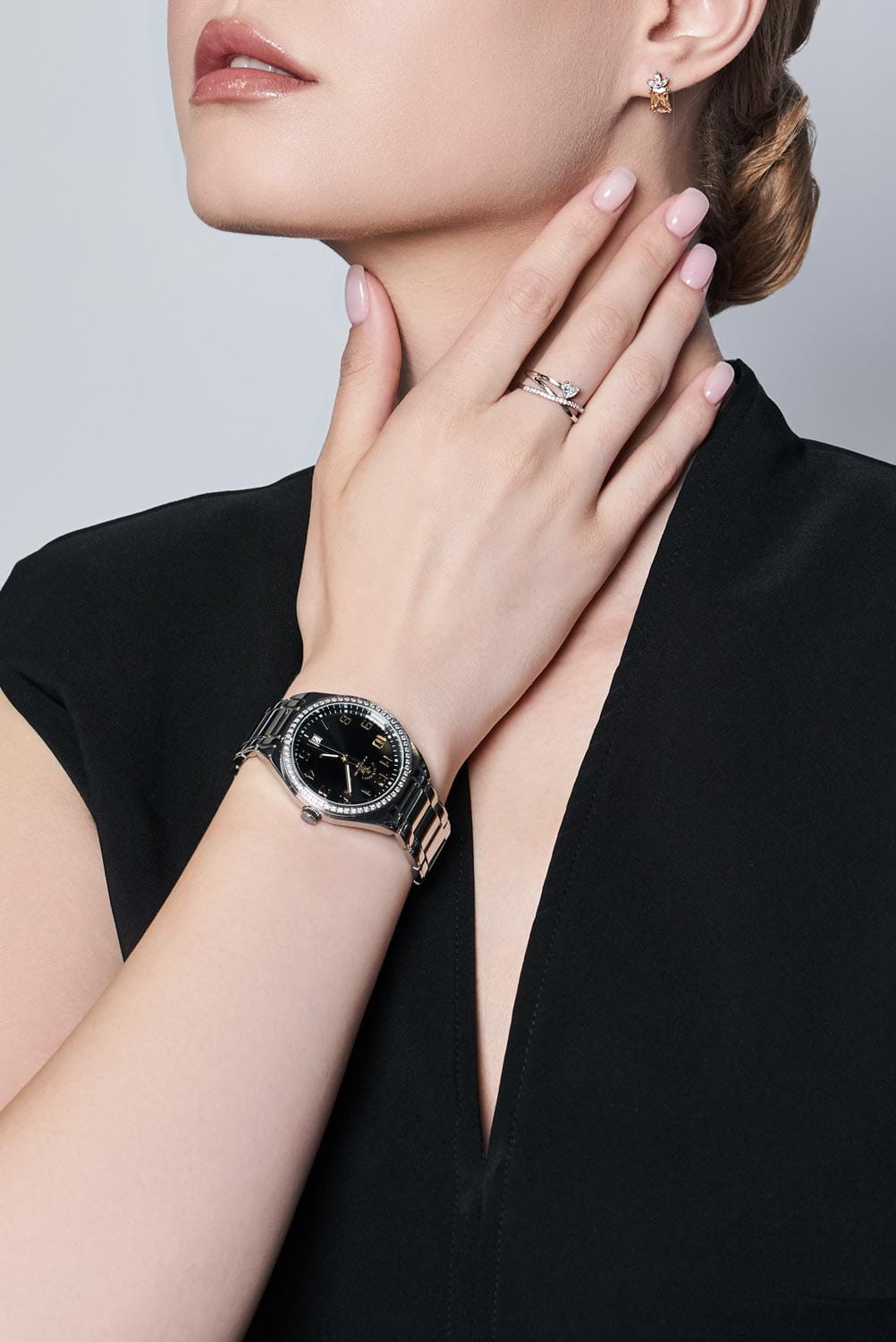 Женские кварцевые часы Santa Barbara Polo & Racquet Club из коллекции Ladies Luxury — это стильный и притягательный аксессуар. Корпус диаметром 36 мм и высотой 42 мм выполнен из материала латунь. БезельБезельВнешний ободок, закрепляющий стекло. В спортивных часах так называется поворотное кольцо с делениями на циферблате, выполняет роль таймера – замеряет отрезки времени на шкале. Неподвижный безель – элемент декора. Однонаправленно вращающийся безель на дайверских часах позволяет фиксировать моменты погружения и выныривания на поверхность. украшен кристаллами, придающими изделию роскошный блеск. Циферблат чёрного цвета оформлен по технологии Sunray («солнечные лучи»), дополнен накладными метками в виде штрихов и фирменным логотипом. Окошко даты расположено в положении 6 часов. Стрелки с люминесцентным покрытиемЛюминесцентное покрытиеПозволяет считывать показания времени в темноте. Производители наносят на стрелки, часовые индексы, безель или поверхность циферблата светонакопительный состав, дающий холодное свечение., обеспечивающим хорошую читаемость в темноте. Циферблат защищён минеральным стекломМинеральное стеклоМинеральное стекло представляет собой искусственно выращенный минерал кварца. Такое стекло отличается особой устойчивостью к повреждениям и царапинам. Уступает по некоторым качествам сапфировому стеклу.. Завинчивающаяся коронка повышает защиту. Часы оснащены стальным браслетом с раскладной застёжкойРаскладная застёжкаТакой тип застёжки используется только на браслетах из металла. Она никогда не раскрывается полностью, происходит разделение на 2 и более частей. Раскладывающая застёжка снизит вероятность потери часов к минимуму.. Водонепроницаемость 50 м позволяет использовать часы в повседневных условиях. Гарантия — 24 месяца. Идеальный выбор для тех, кто ценит элегантность, блеск и качество.