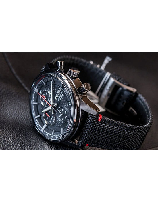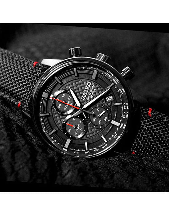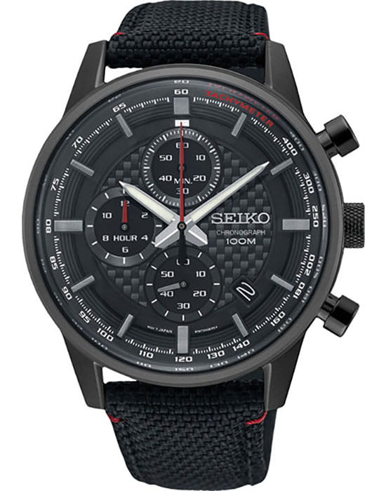 Аксессуар выполнен из нержавеющей стали 316L, материал устойчив к повреждениям. Кварцевый хронографХронографФункция позволяет измерять отрезки времени с особой точностью: часы, минуты, секунды. Верным признаком хронографа является наличие на циферблате 3 дополнительных окошек-счётчиков. оснащён японским механизмом Seiko 8T67 с точностью хода ±15 секунд в месяц. Калибр работает от батарейки, рассчитанной на 3 года. Функции: секундомер, календарь, тахиметрТахиметрРазмеченная шкала, располагается на ободке или безеле часов. Тахиметр позволяет рассчитать скорость на определённом участке пути, расстояние измеряется в километрах или милях.. Ремешок из нейлона имеет кожаную основу.