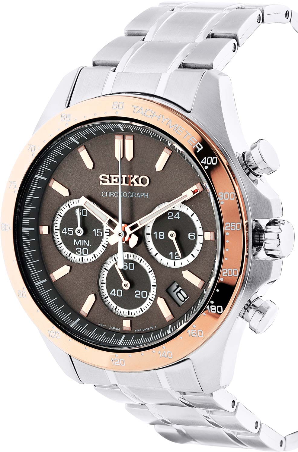Мужские японские часы-хронографХронографФункция позволяет измерять отрезки времени с особой точностью: часы, минуты, секунды. Верным признаком хронографа является наличие на циферблате 3 дополнительных окошек-счётчиков. с секундомеромСекундомерСекундоме́р — прибор, способный измерять интервалы времени с точностью до долей секунды. Seiko Spirit Chronograph SBTR026 — это великолепное сочетание стиля и функциональности, созданное для современных искателей приключений. Минеральное стеклоМинеральное стеклоМинеральное стекло представляет собой искусственно выращенный минерал кварца. Такое стекло отличается особой устойчивостью к повреждениям и царапинам. Уступает по некоторым качествам сапфировому стеклу. с повышенной прочности Hardlex гарантирует защиту циферблата от царапин, сохраняя их безупречный вид на протяжении долгого времени. Внутри этих часов установлен кварцевый механизм, который обеспечивает высокую точность и надежность, позволяя вам всегда оставаться в курсе времени. Класс водозащиты в 100 метров позволяет вам не только плавать и нырять, но и заниматься разнообразными водными видами спорта, уверенно полагаясь на это надежное устройство, которое выдержит даже самые экстремальные условия. Корпус и браслет часов изготовлены из прочной нержавеющей стали, что укрепляет их долговечность и подчеркивает современный дизайн. Неподвижный безельБезельВнешний ободок, закрепляющий стекло. В спортивных часах так называется поворотное кольцо с делениями на циферблате, выполняет роль таймера – замеряет отрезки времени на шкале. Неподвижный безель – элемент декора. Однонаправленно вращающийся безель на дайверских часах позволяет фиксировать моменты погружения и выныривания на поверхность. с PVD-покрытиемPVDУльтратонкое покрытие наносится в технике вакуумного напыления, сочетает в себе нитрид титана особой прочности со слоем золота или оксида хрома. Несёт в себе декоративную или защитную функцию. цвета розового золота, диаметр 42 мм. Шкала тахиметраТахиметрРазмеченная шкала, располагается на ободке или безеле часов. Тахиметр позволяет рассчитать скорость на определённом участке пути, расстояние измеряется в километрах или милях. по внешнему краю. Удобное окошко даты в позиции между 4 и 5 часов, делает эти часы еще более практичными, позволяя быстро сверять текущую дату. Кроме того, стрелки и метки часов оснащены люминесцентным покрытиемЛюминесцентное покрытиеПозволяет считывать показания времени в темноте. Производители наносят на стрелки, часовые индексы, безель или поверхность циферблата светонакопительный состав, дающий холодное свечение., что обеспечивает отличную видимость даже в условиях низкой освещенности, поэтому вы всегда сможете узнать время, независимо от окружающей среды. Стальной браслет на раскладной застёжкеРаскладная застёжкаТакой тип застёжки используется только на браслетах из металла. Она никогда не раскрывается полностью, происходит разделение на 2 и более частей. Раскладывающая застёжка снизит вероятность потери часов к минимуму. обеспечивает комфорт и удобство в использовании, добавляя завершающий штрих к этому стильному и высокоэффективному аксессуару.