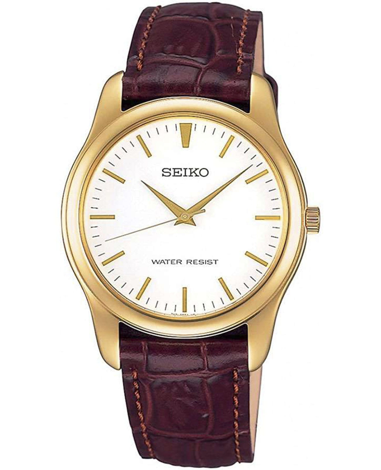 Женские кварцевые часы Seiko — это надёжный и универсальный аксессуар. Корпус диаметром 35 мм выполнен из нержавеющей стали с IP-покрытиемIP-покрытиеМетод ионного напыления. Демонстрирует повышенную устойчивость к истиранию, окислению и химическим веществам. Под воздействием высокого давления и температуры около 1500°C молекулы металла надёжно соединяются с частицами корпуса часов. цвета жёлтого золота. Циферблат белого цвета оформлен индексами и стрелками, включая центральную секундную стрелку. Циферблат защищён прочным закалённым минеральным стеклом Hardlex минеральным стекломМинеральное стеклоМинеральное стекло представляет собой искусственно выращенный минерал кварца. Такое стекло отличается особой устойчивостью к повреждениям и царапинам. Уступает по некоторым качествам сапфировому стеклу.. Механизм — японское кварцевое движение калибра 7N01 с высокой точностью хода (±10–15 сек. в месяц). Часы оснащены коричневым кожаным ремешком на классической пряжке. Водонепроницаемость 30 м позволяет использовать часы в повседневных условиях. Идеальный выбор для тех, кто ценит японское качество и классический дизайн.