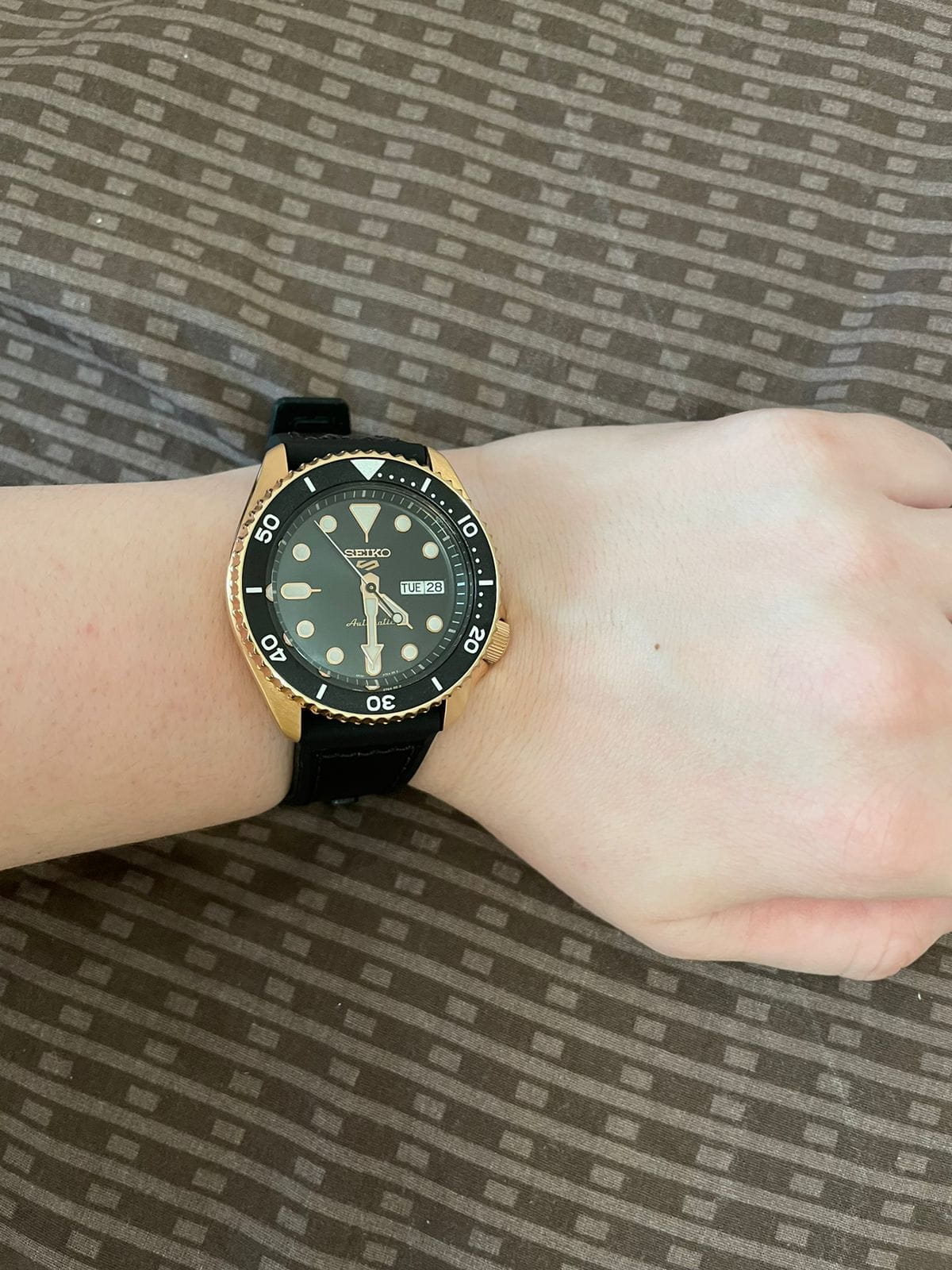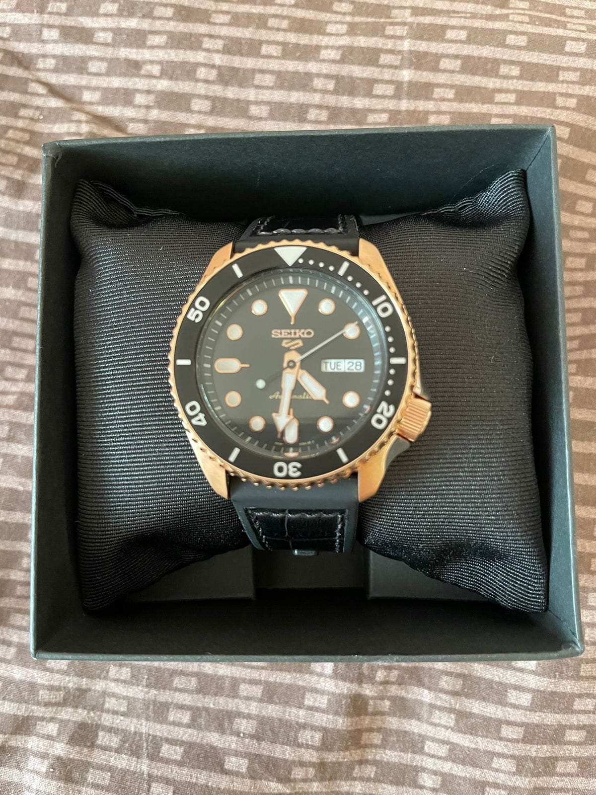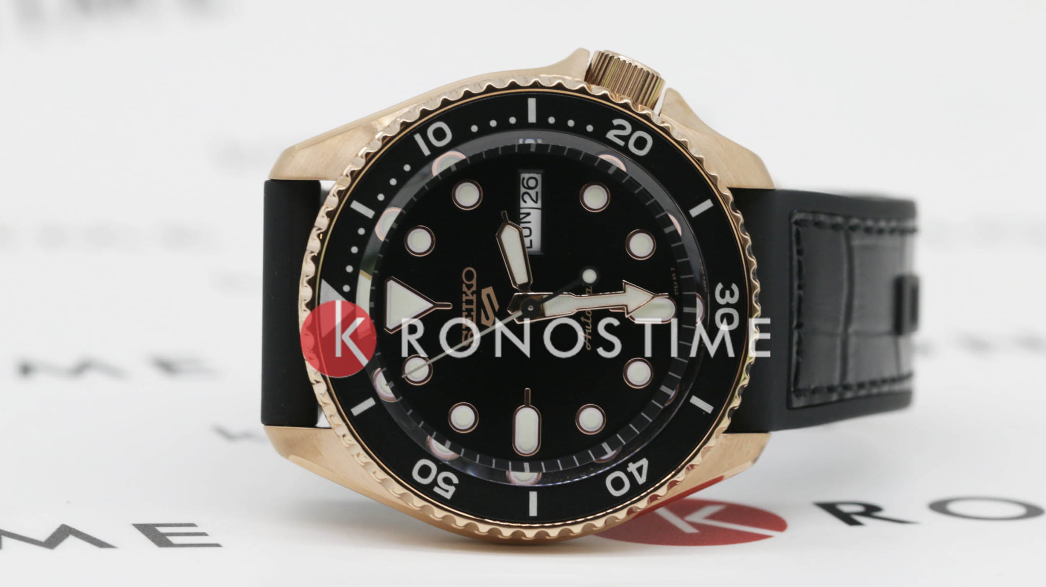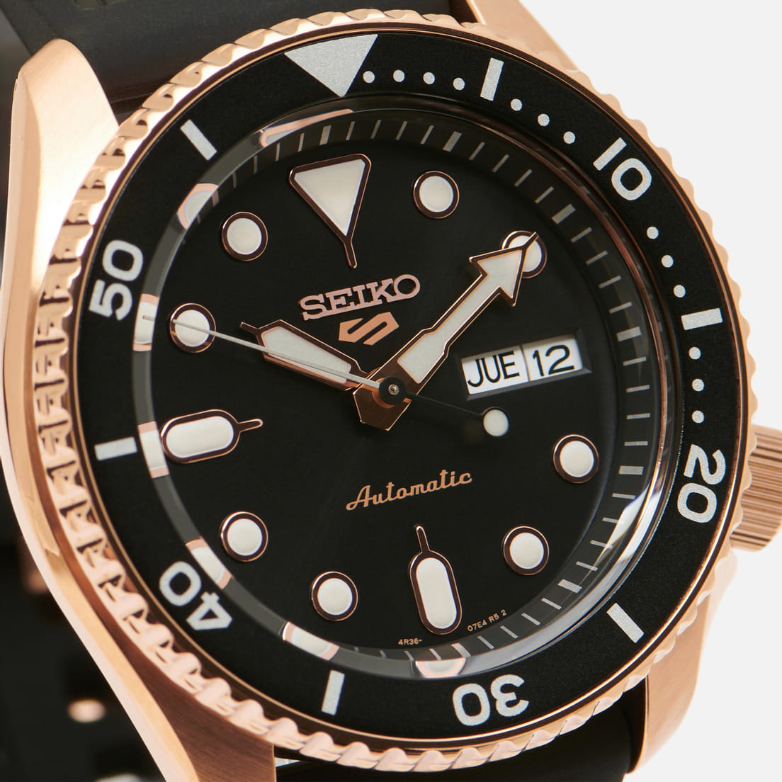 Часы Seiko 5 Sports SRPD76K1 сочетают в себе элегантный дизайн и надёжность, характерные для японского часового мастерства. Корпус диаметром 42,5 мм выполнен из нержавеющей стали с PVD-покрытиемPVDУльтратонкое покрытие наносится в технике вакуумного напыления, сочетает в себе нитрид титана особой прочности со слоем золота или оксида хрома. Несёт в себе декоративную или защитную функцию. розового золота, придающим часам утончённый вид. Чёрный циферблат защищён минеральным стекломМинеральное стеклоМинеральное стекло представляет собой искусственно выращенный минерал кварца. Такое стекло отличается особой устойчивостью к повреждениям и царапинам. Уступает по некоторым качествам сапфировому стеклу. с повышенной прочностью. ​​