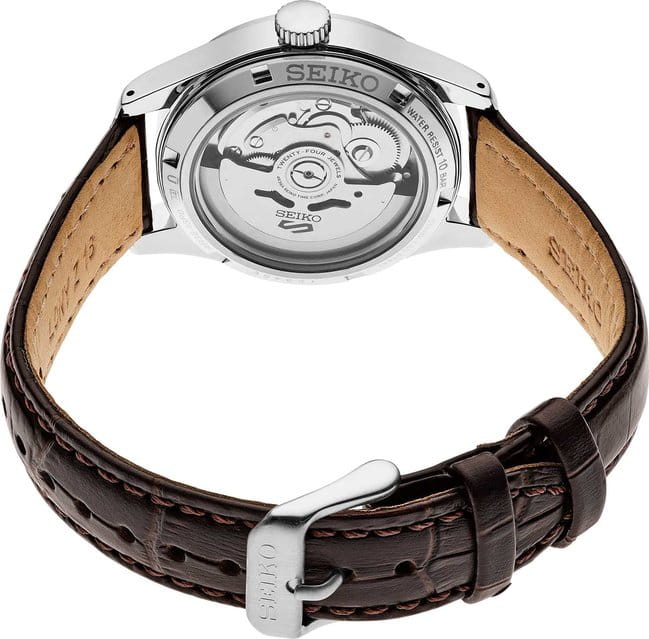 Модель Seiko SRPJ89 из коллекции Seiko 5 Sports Field — это компактные автоматические часы с выразительным зелёным циферблатом и прочной конструкцией. Корпус диаметром 36,4 мм выполнен из нержавеющей стали, с прозрачной задней крышкой и водозащитой до 100 метров.