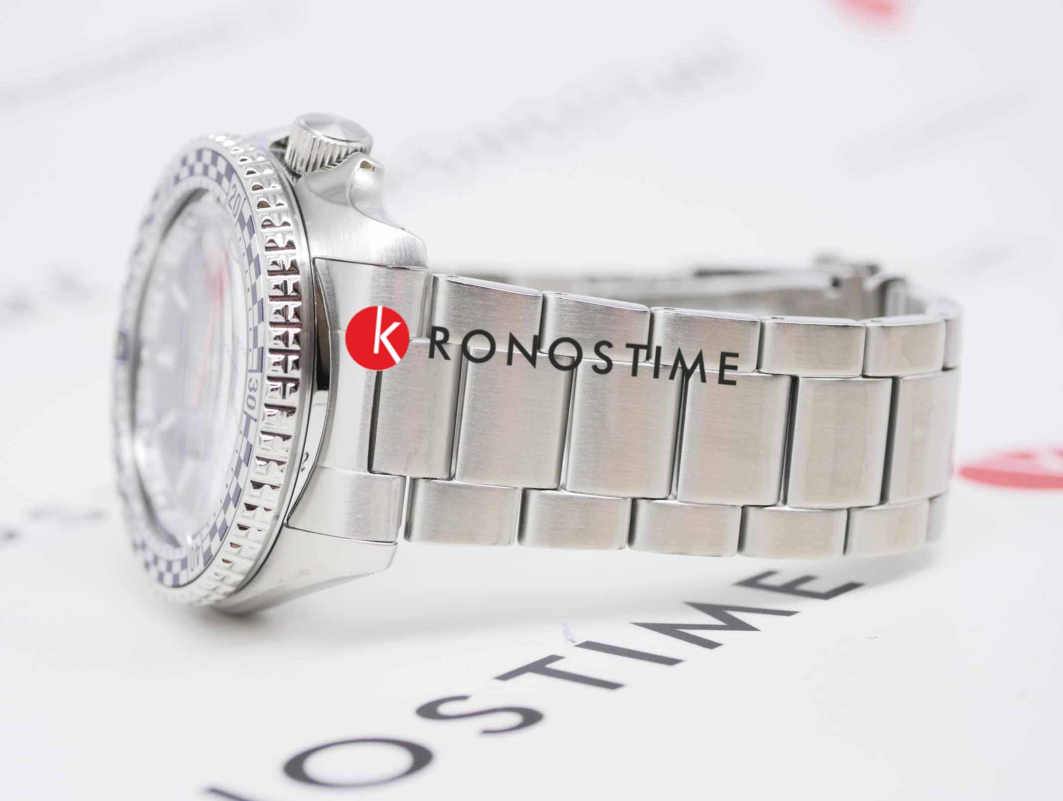 Корпус и браслет часов изготовлены из стали, а поворотный безельБезельВнешний ободок, закрепляющий стекло. В спортивных часах так называется поворотное кольцо с делениями на циферблате, выполняет роль таймера – замеряет отрезки времени на шкале. Неподвижный безель – элемент декора. Однонаправленно вращающийся безель на дайверских часах позволяет фиксировать моменты погружения и выныривания на поверхность. частично покрыт PVD-покрытиемPVDУльтратонкое покрытие наносится в технике вакуумного напыления, сочетает в себе нитрид титана особой прочности со слоем золота или оксида хрома. Несёт в себе декоративную или защитную функцию., что придает часам современный и стильный вид. Окошки даты и дня недели удобно расположены на отметке 3 часа. Стрелки с люминесцентным покрытиемЛюминесцентное покрытиеПозволяет считывать показания времени в темноте. Производители наносят на стрелки, часовые индексы, безель или поверхность циферблата светонакопительный состав, дающий холодное свечение. позволяют четко считывать время даже в условиях низкой освещенности. Браслет на раскладной застёжкеРаскладная застёжкаТакой тип застёжки используется только на браслетах из металла. Она никогда не раскрывается полностью, происходит разделение на 2 и более частей. Раскладывающая застёжка снизит вероятность потери часов к минимуму. обеспечивает удобное и надежное крепление на запястье.