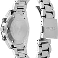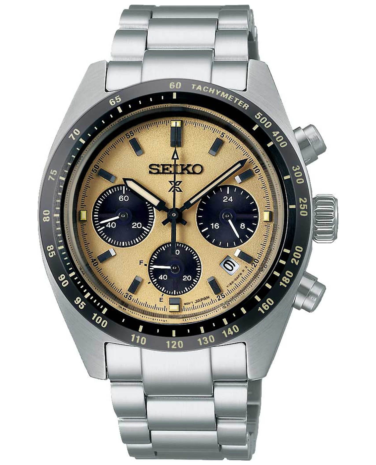 Seiko Prospex Speedtimer SSC815 — это стильный и технологичный хронограф с солнечным питанием, вдохновлённый культовыми спортивными часами Seiko 1964 года. Модель сочетает в себе точность кварцевого механизма и экологичное энергоснабжение, обеспечивая запас хода до 6 месяцев при полной зарядке. Часы оснащены калибром V192 с функцией отображения второго часового пояса, хронографом с точностью измерения до 1/5 секунды и возможностью измерения времени до 60 минут. Также реализованы ретроградный индикатор уровня заряда аккумулятора, функция тахиметраТахиметрРазмеченная шкала, располагается на ободке или безеле часов. Тахиметр позволяет рассчитать скорость на определённом участке пути, расстояние измеряется в километрах или милях. и отображение даты в положении между 4 и 5 часами. Циферблат оформлен с применением фирменного люминесцентного покрытияЛюминесцентное покрытиеПозволяет считывать показания времени в темноте. Производители наносят на стрелки, часовые индексы, безель или поверхность циферблата светонакопительный состав, дающий холодное свечение. LumiBrite на стрелках и штриховых метках, обеспечивающего отличную читаемость даже в темноте. Защиту циферблата обеспечивает сапфировое стеклоСапфировое стеклоПрочный и надёжный материал из кристалла сапфира синтетического происхождения, характеризующийся особой твёрдостью и устойчивостью к царапинам и повреждениям. с выпуклой формой и антибликовым покрытиемАнтибликовое покрытиеСлой оксида металла в 0,13-0,3 микрон, благодаря которому стекло часов не бликует и не отражает свет. Антибликовое покрытие уменьшает отражение света в 10 раз, обеспечивая отличную читаемость показателей циферблата. на внутренней поверхности. Корпус диаметром 39 мм изготовлен из нержавеющей стали, а задняя крышка — завинчивающаяся, что подчёркивает внимание к деталям и обеспечивает дополнительную защиту механизма. Часы водонепроницаемы до 100 метров (), что позволяет использовать их при плавании и других водных активностях. Браслет выполнен из стали и оснащён трёхсгибной раскладной застёжкойРаскладная застёжкаТакой тип застёжки используется только на браслетах из металла. Она никогда не раскрывается полностью, происходит разделение на 2 и более частей. Раскладывающая застёжка снизит вероятность потери часов к минимуму. с кнопочным механизмом, обеспечивающей комфорт и уверенную фиксацию на запястье. Расстояние между ушками составляет 20 мм, что делает модель совместимой со стандартными браслетами. Эти часы станут универсальным аксессуаром для тех, кто ценит сочетание технологичности, истории и эстетики — идеальный выбор как для повседневного использования, так и для особых случаев.