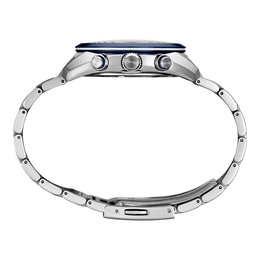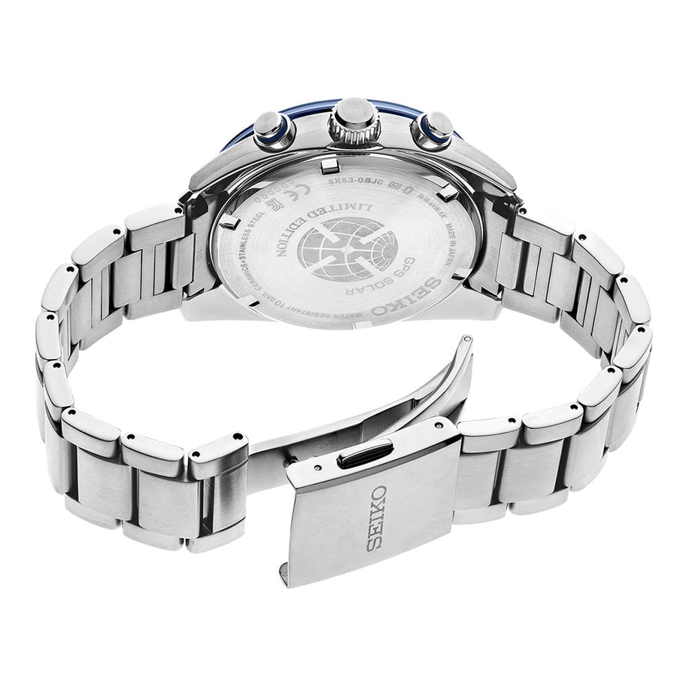 Seiko Astron GPS Solar SSH093J1 — это высокотехнологичные наручные часы, сочетающие инновационную спутниковую связь с экологичным питанием от света. Модель выпущена ограниченным тиражом 1400 экземпляров в честь 140-летнего юбилея бренда и представляет собой вершину современного часового мастерства. Часы оснащены калибром 5X53 — кварцевым механизмом с GPS-модулем, который позволяет автоматически определять местоположение, устанавливать точное время и корректировать часовой пояс одним нажатием кнопки. Они поддерживают все 39 мировых часовых поясов и автоматически распознают переход на летнее/зимнее время. Также реализована функция передачи времени между основным и дополнительным циферблатами, а также возможность ручной коррекции стрелок. Энергия для работы аккумулируется в интегрированном аккумуляторе, который заряжается от любого источника света благодаря технологии Tough SolarTough SolarТехнология основана на подзарядке аккумулятора от источника солнечного света, специальная панель улавливает солнечные лучи и преобразует их в энергию для работы часов. Достаточно пары минут нахождения на солнце для функционирования часов в течении суток.. При полной зарядке запас хода составляет до 6 месяцев, а при активированном режиме энергосбережения — до 2 лет. Часы также имеют индикатор уровня зарядкиEOLПредставляет собой систему, уведомляющую владельца часов о необходимости замены элемента питания. За 2 недели до полного разряда батарейки секундная стрелка перестаёт ходить чётко и начинает перепрыгивать на 3-4 деления. и защиту от перезарядки. Циферблат белого цвета оформлен с применением фирменного люминесцентного покрытия LumiBriteЛюминесцентное покрытиеПозволяет считывать показания времени в темноте. Производители наносят на стрелки, часовые индексы, безель или поверхность циферблата светонакопительный состав, дающий холодное свечение. на стрелках и штриховых метках, обеспечивающего отличную читаемость даже в темноте. День недели и число выводятся на отдельных малых циферблатах, а окошко даты размещено между отметками 4 и 5 часов. Ретроградный индикатор отображает уровень заряда, статус приёма GPS-сигнала, режим «В полете» и настройки летнего времени. Время отображается в 12- и 24-часовом формате. Корпус диаметром 42,7 мм изготовлен из гипоаллергенной стали с комбинацией сатинированных и полированных поверхностей, дополнен керамическим безелем, устойчивым к царапинам. Защиту механизма обеспечивает сапфировое стеклоСапфировое стеклоПрочный и надёжный материал из кристалла сапфира синтетического происхождения, характеризующийся особой твёрдостью и устойчивостью к царапинам и повреждениям. с двойным изгибом и антибликовым покрытием. Завинчивающаяся задняя крышка украшена надписью LIMITED EDITION, подчёркивающей уникальность модели. Браслет выполнен из стали и оснащён трёхсгибной раскладной застёжкойРаскладная застёжкаТакой тип застёжки используется только на браслетах из металла. Она никогда не раскрывается полностью, происходит разделение на 2 и более частей. Раскладывающая застёжка снизит вероятность потери часов к минимуму. с технологией Smart Adjuster, позволяющей легко адаптировать размер под любое запястье. Рифлёная заводная головка не только удобна в использовании, но и подчёркивает спортивный стиль часов. Модель обладает водонепрониц