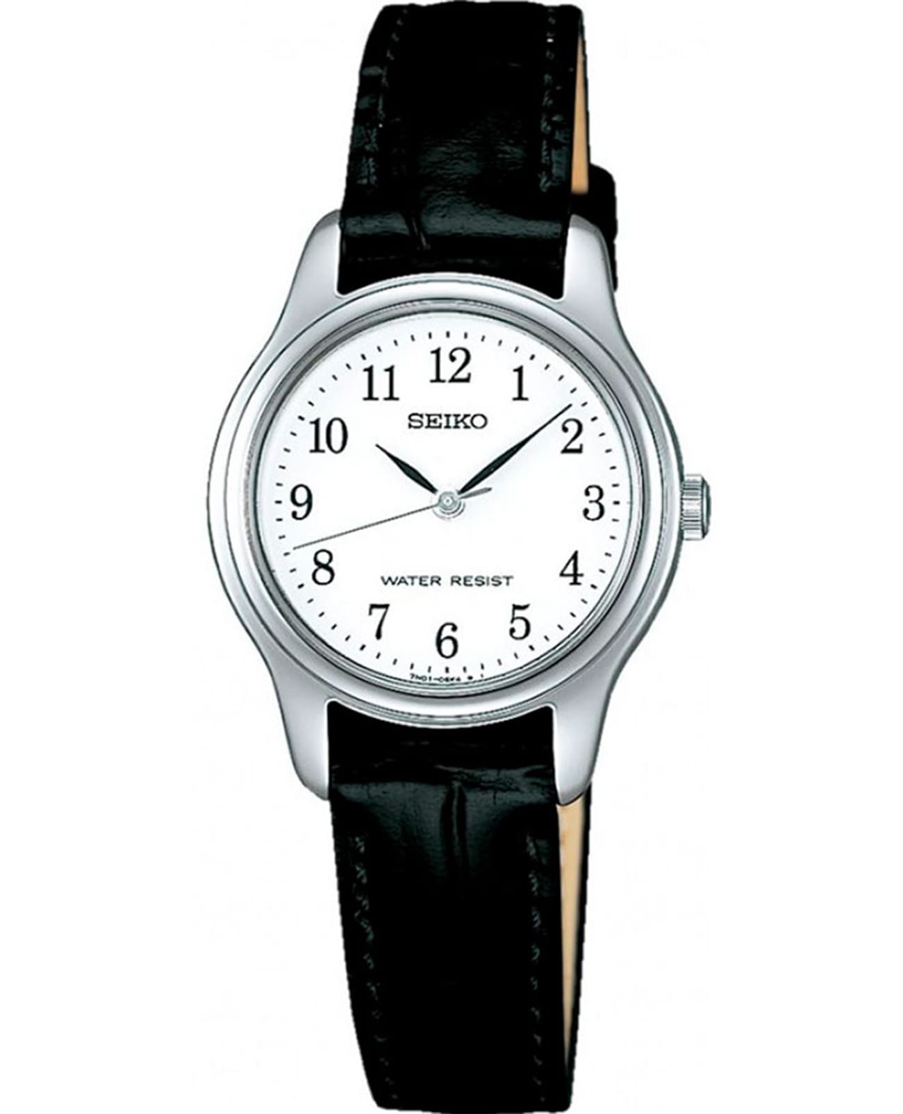 Женские кварцевые часы Seiko — это надёжный и универсальный аксессуар. Корпус диаметром 25,8 мм и толщиной 6,2 мм выполнен из нержавеющей стали. Циферблат белого цвета оформлен арабскими цифрами и стрелками, включая центральную секундную стрелку. Циферблат защищён прочным закалённым минеральным стеклом Hardlex минеральным стекломМинеральное стеклоМинеральное стекло представляет собой искусственно выращенный минерал кварца. Такое стекло отличается особой устойчивостью к повреждениям и царапинам. Уступает по некоторым качествам сапфировому стеклу.. Механизм — японское кварцевое движение калибра 7N01 с высокой точностью хода (±10–15 сек. в месяц). Часы оснащены чёрным кожаным ремешком на классической пряжке. Водонепроницаемость 30 м позволяет использовать часы в повседневных условиях. Идеальный выбор для тех, кто ценит японское качество и классический дизайн.