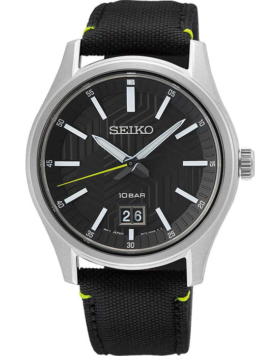 Мужские японские часы Seiko Discover More SUR517P1 c кварцевым механизмом с высокой точностью с калибром 6N76. Сапфировое стеклоСапфировое стеклоПрочный и надёжный материал из кристалла сапфира синтетического происхождения, характеризующийся особой твёрдостью и устойчивостью к царапинам и повреждениям., устойчивое к появлению царапин, обладающее высокой прозрачностью. Класс водозащиты: 100 метров, позволит плавать, нырять и заниматься другими водными видами спорта. Корпус из стали, а браслет изготовлен из нейлона. Стрелки и метки с люминесцентным покрытиемЛюминесцентное покрытиеПозволяет считывать показания времени в темноте. Производители наносят на стрелки, часовые индексы, безель или поверхность циферблата светонакопительный состав, дающий холодное свечение. LumiBrite. Ремешок со стандартной застежкой. Окошко даты находится в положении 6 часов.