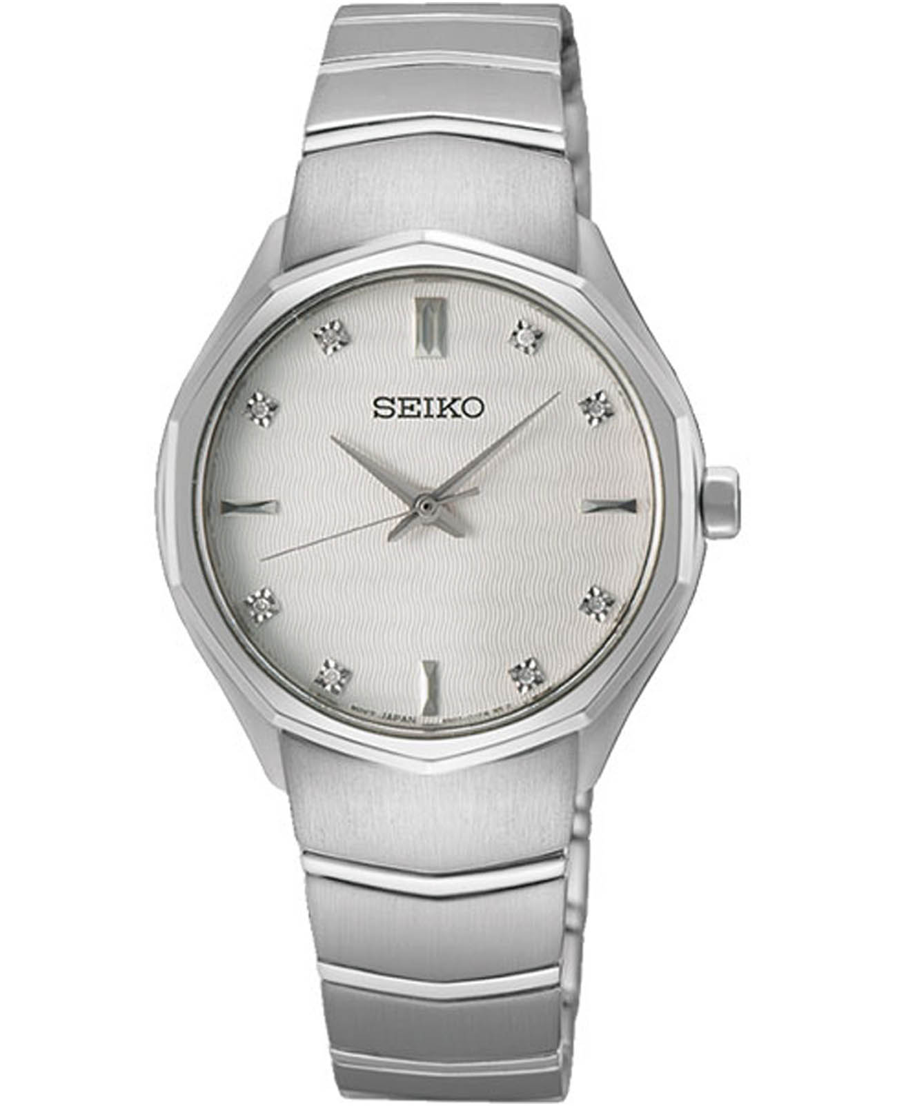 Женские японские часы Seiko Conceptual Series Dress SUR615P1 c кварцевым механизмом с высокой точностью. Сапфировое стеклоСапфировое стеклоПрочный и надёжный материал из кристалла сапфира синтетического происхождения, характеризующийся особой твёрдостью и устойчивостью к царапинам и повреждениям. с антибликовым покрытиемАнтибликовое покрытиеСлой оксида металла в 0,13-0,3 микрон, благодаря которому стекло часов не бликует и не отражает свет. Антибликовое покрытие уменьшает отражение света в 10 раз, обеспечивая отличную читаемость показателей циферблата. , устойчивое к появлению царапин, обладающее высокой прозрачностью. Водозащита до 5 ATM позволяет не снимать часы при дожде, мытье рук или случайных брызгах. Корпус и браслет изготовлены из нержавеющей стали. Браслет с раскладной застёжкойРаскладная застёжкаТакой тип застёжки используется только на браслетах из металла. Она никогда не раскрывается полностью, происходит разделение на 2 и более частей. Раскладывающая застёжка снизит вероятность потери часов к минимуму. с фиксатором. Белый циферблат украшен бриллиантами. Seiko — это гармония изящного дизайна и технологичной надёжности, компактный и стильный выбор для повседневной классики.