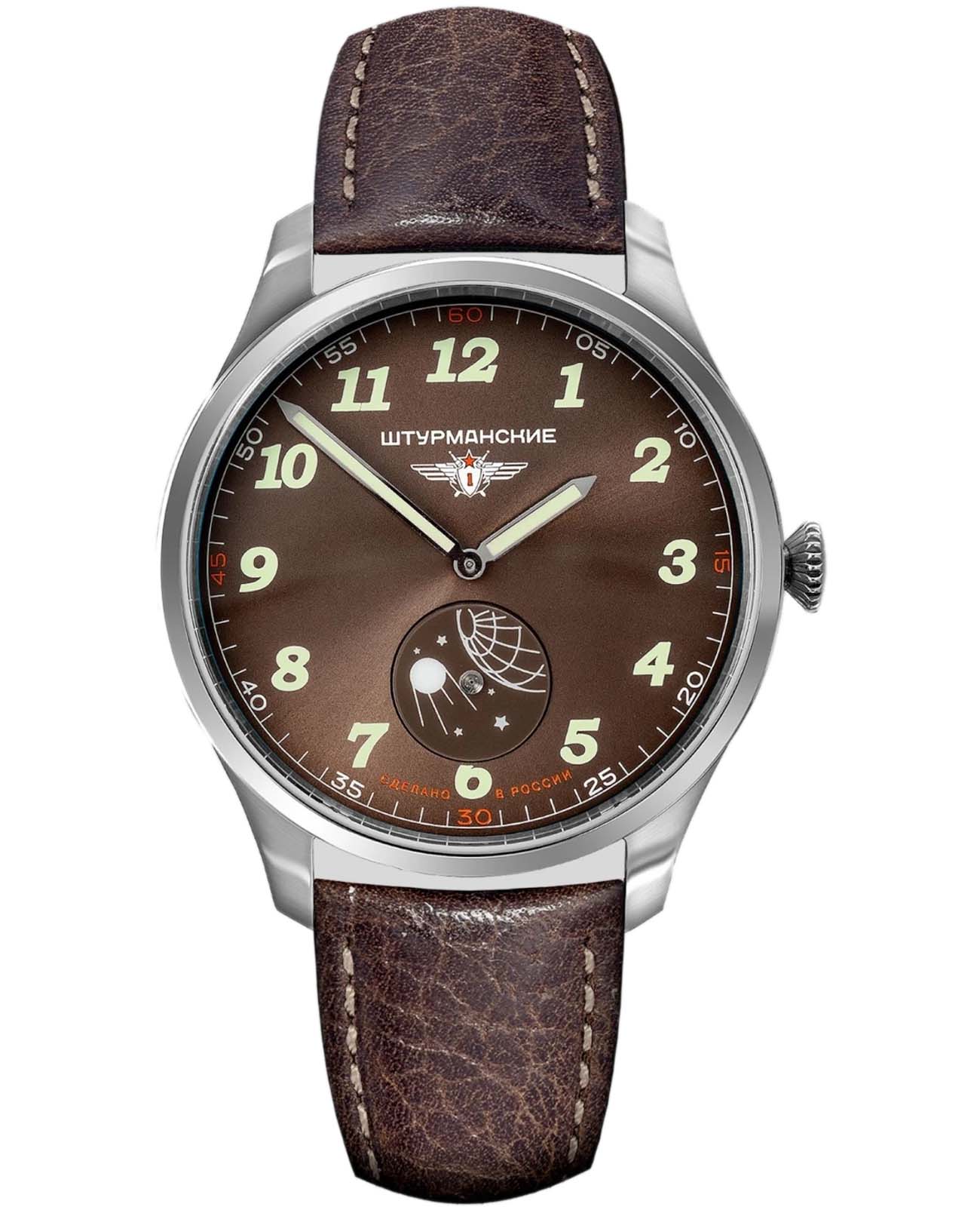 Штурманские мужские российские кварцевые часы с минеральным стекломМинеральное стеклоМинеральное стекло представляет собой искусственно выращенный минерал кварца. Такое стекло отличается особой устойчивостью к повреждениям и царапинам. Уступает по некоторым качествам сапфировому стеклу. кварцевый механизм с высокой точностью. Класс водозащиты: 50 метров, позволит защитить корпус от случайных брызг или капель дождя. Корпус часов изготовлен из стали. Кожаный ремешок на стандартной застёжке. Стрелки и метки с люминесцентным покрытиемЛюминесцентное покрытиеПозволяет считывать показания времени в темноте. Производители наносят на стрелки, часовые индексы, безель или поверхность циферблата светонакопительный состав, дающий холодное свечение..