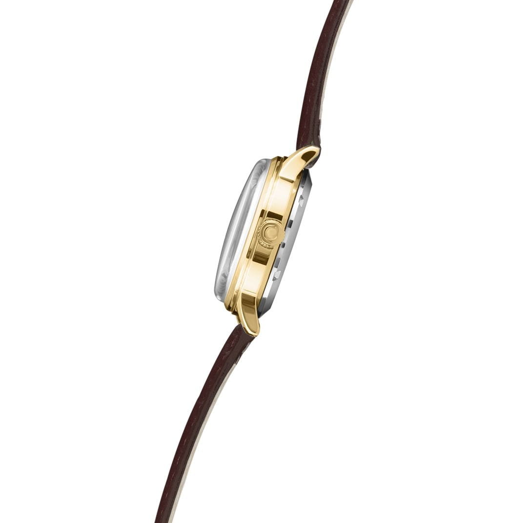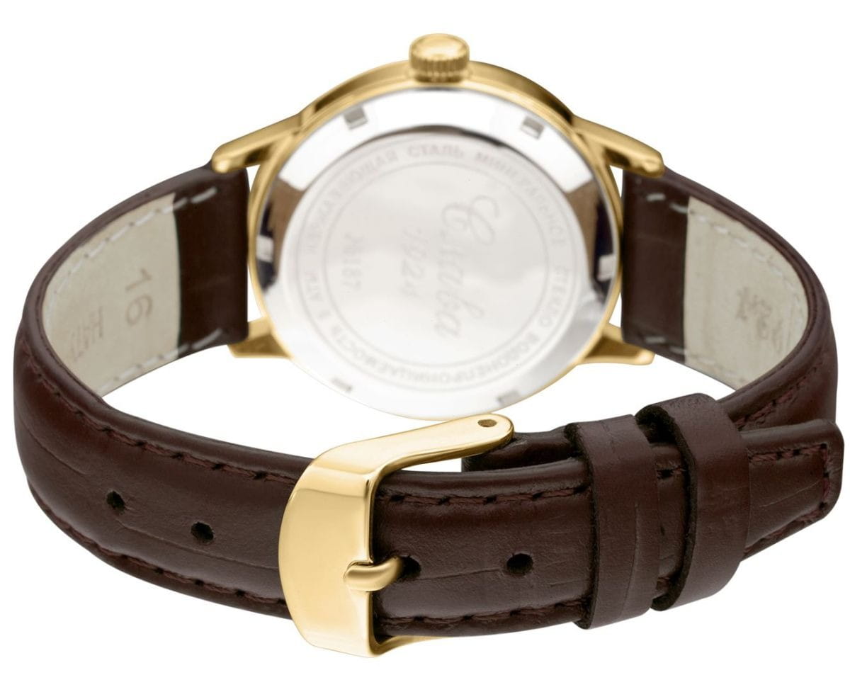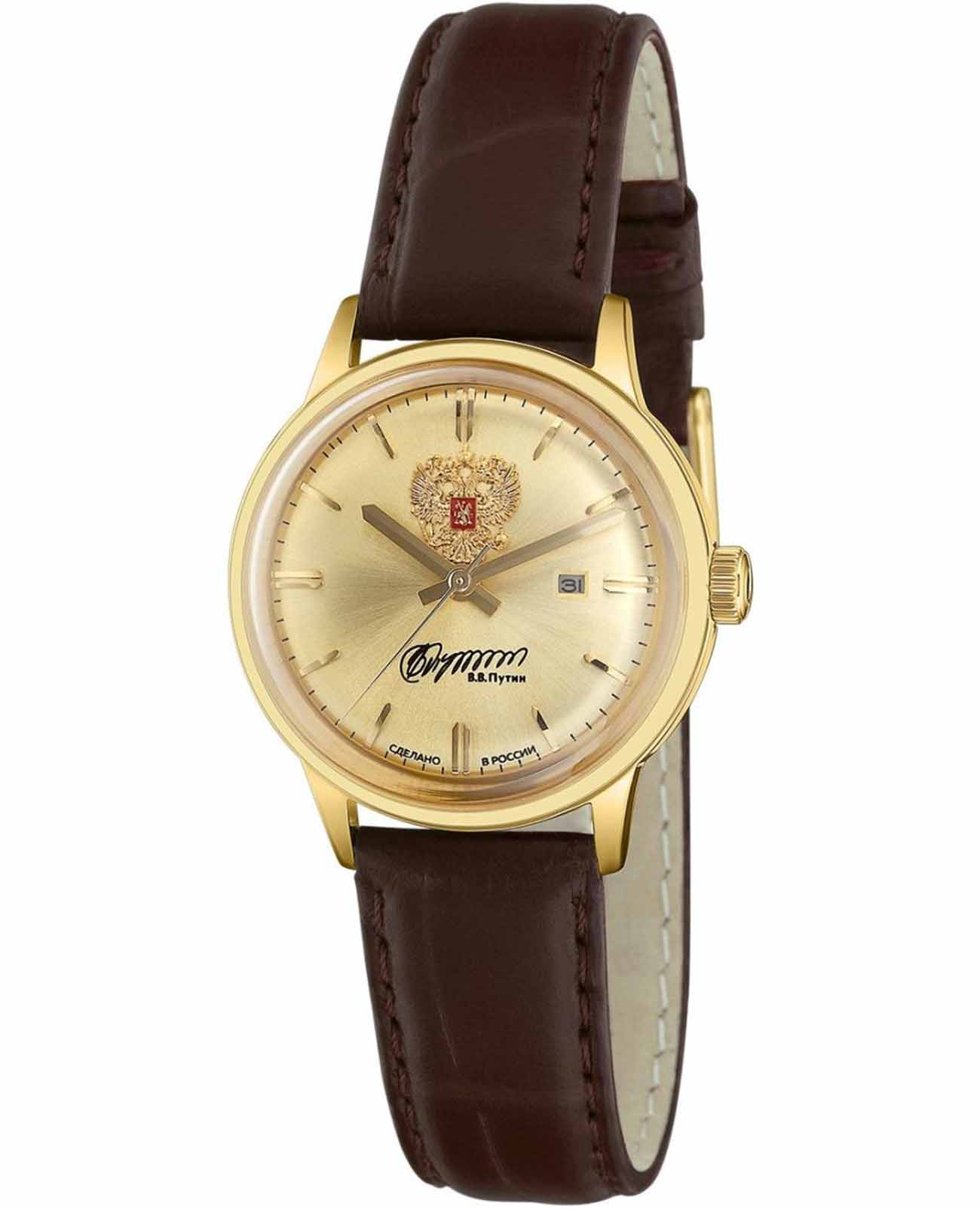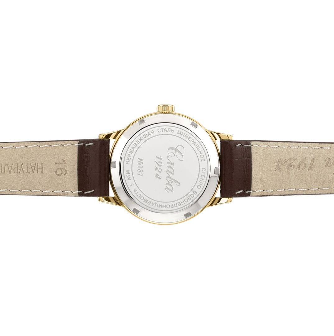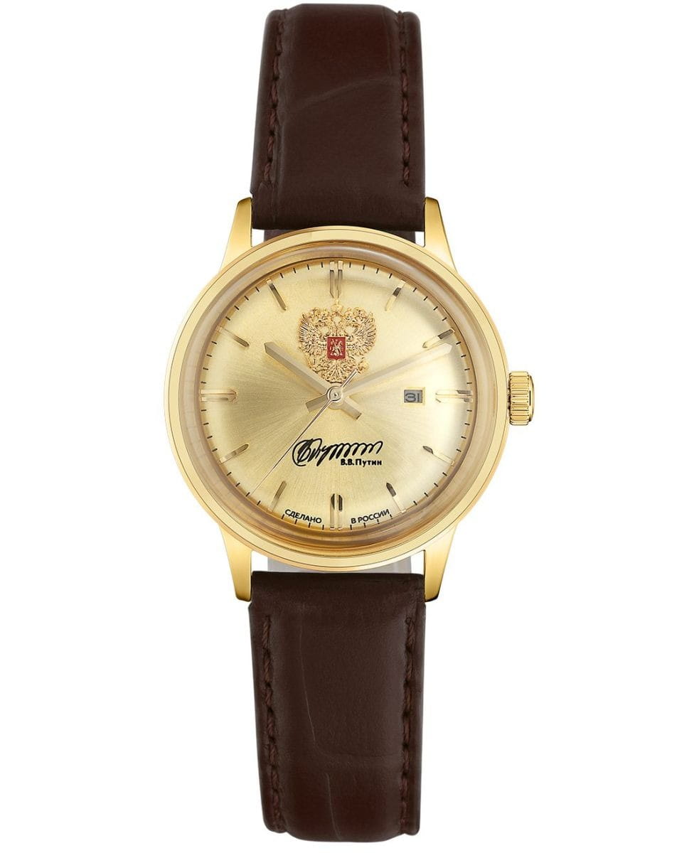 Российские механические наручные часы Слава 1879094/300-6Т15 станут стильным и надежным аксессуаром для вашего образа. Эти элегантные часы созданы с акцентом на высокое качество и изысканный дизайн. Оборудованные механизмом Miyota 6T15 с автоподзаводом, они обеспечивают точность и надежность, поддерживая запас хода до 40 часов. Часы заключены в прочный стальной корпус с IP-покрытиемIP-покрытиеМетод ионного напыления. Демонстрирует повышенную устойчивость к истиранию, окислению и химическим веществам. Под воздействием высокого давления и температуры около 1500°C молекулы металла надёжно соединяются с частицами корпуса часов. диаметром 32 мм и минеральным стекломМинеральное стеклоМинеральное стекло представляет собой искусственно выращенный минерал кварца. Такое стекло отличается особой устойчивостью к повреждениям и царапинам. Уступает по некоторым качествам сапфировому стеклу., что обеспечивает надежную защиту и долговечность. Золотистый циферблат, выполненный по технологии Sunray, украшен изображением герба Российской Федерации и автографом В.В. Путина. Широкие заостренные стрелки в стиле Baton и штриховые метки придают циферблату выразительность и читаемость. Часы оснащены календарем с окошком даты на 3 часах, что делает их еще более функциональными. Рифленая заводная головка и завинчивающаяся задняя крышка добавляют изделию надежности и комфорта в использовании. Завершает образ текстурированный кожаный ремешок коричневого цвета с классической застежкой, который обеспечивает удобную посадку на запястье. Благодаря водозащите до 50WR, эти часы подойдут для повседневного использования, сохраняя свой безупречный вид и функциональность.