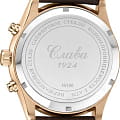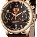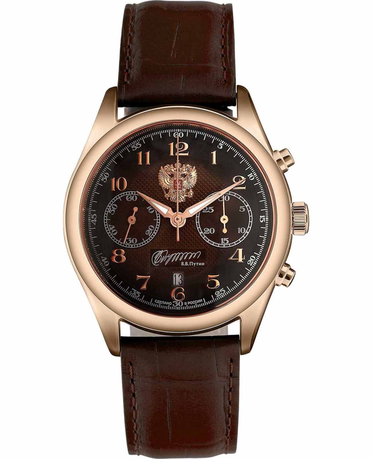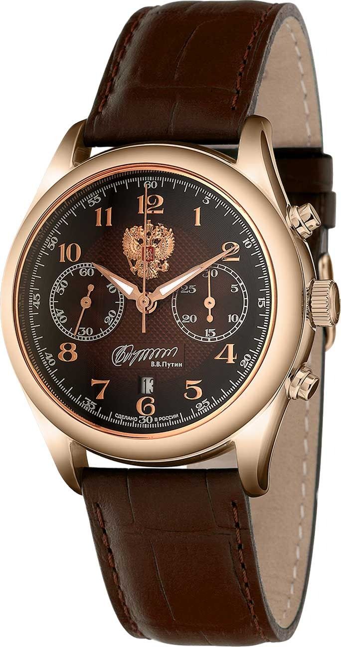 Российские механические часы-хронографХронографФункция позволяет измерять отрезки времени с особой точностью: часы, минуты, секунды. Верным признаком хронографа является наличие на циферблате 3 дополнительных окошек-счётчиков. с секундомеромСекундомерСекундоме́р — прибор, способный измерять интервалы времени с точностью до долей секунды. Слава 1883142/300-4617, созданные для тех, кто ценит стиль и надежность. Эти часы сочетают в себе классический дизайн и современные технологии, предлагая исключительную функциональность и элегантность. Часы оснащены механизмом Peacock 4617 с автоподзаводом, а запас хода достигает 45 часов, что делает их идеальным выбором для повседневного использования. Корпус часов диаметром 42 мм выполнен из стали с изысканным розовым IP-покрытиемIP-покрытиеМетод ионного напыления. Демонстрирует повышенную устойчивость к истиранию, окислению и химическим веществам. Под воздействием высокого давления и температуры около 1500°C молекулы металла надёжно соединяются с частицами корпуса часов.. Коричневый циферблат украшен изображением герба Российской Федерации и дополнен арабскими цифрами, что обеспечивает отличную читаемость. Стрелки с люминесцентным покрытиемЛюминесцентное покрытиеПозволяет считывать показания времени в темноте. Производители наносят на стрелки, часовые индексы, безель или поверхность циферблата светонакопительный состав, дающий холодное свечение. облегчают чтение времени даже в условиях слабого освещения. Окошко даты расположено в положении 6 часов, добавляя дополнительную практичность. Защиту обеспечивает сапфировое стеклоСапфировое стеклоПрочный и надёжный материал из кристалла сапфира синтетического происхождения, характеризующийся особой твёрдостью и устойчивостью к царапинам и повреждениям., устойчивое к царапинам, и водозащита до 50WR, что позволяет носить часы в различных условиях. Рифленая заводная головка и кожаный ремешок с классической застежкой завершают образ, придавая часам дополнительную элегантность и комфорт.