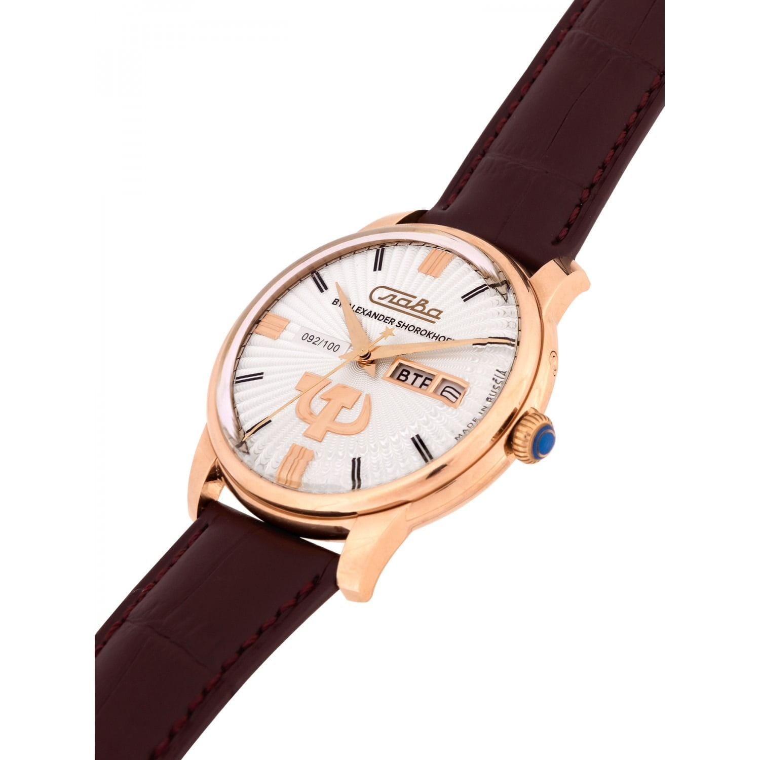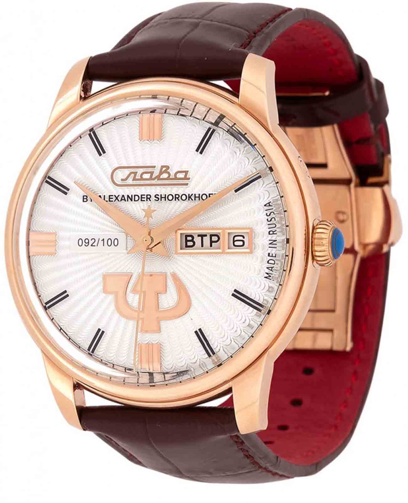Российские механические часы с автоподзаводом Слава Революция 2603269/300-2427 созданы для тех, кто ценит стиль и надежность. Эта модель является плодом сотрудничества Часовой компании «Слава» и знаменитого мастера Александра Шорохова, который известен своим вкладом в возрождение российского часового мастерства и продвижение культуры в мире. Эти часы выполнены в соответствии с эскизами мастера, с использованием революционных символов — серпа и молота. Часы Слава «Революция» обладают механизмом с автоподзаводом «Слава 2427», украшенным ручной гравировкой, который можно наблюдать через прозрачную заднюю крышку. Этот механизм обеспечивает надежность и точность, а также добавляет элемент эксклюзивности. Корпус часов выполнен из стали c IP-покрытиемIP-покрытиеМетод ионного напыления. Демонстрирует повышенную устойчивость к истиранию, окислению и химическим веществам. Под воздействием высокого давления и температуры около 1500°C молекулы металла надёжно соединяются с частицами корпуса часов. золотистого цвета, который гармонично сочетается с белым циферблатом. Диаметр корпуса составляет 44 мм, а толщина — 14,5 мм, что делает часы выразительными и комфортными для носки. Сапфировое стеклоСапфировое стеклоПрочный и надёжный материал из кристалла сапфира синтетического происхождения, характеризующийся особой твёрдостью и устойчивостью к царапинам и повреждениям. защищает циферблат от царапин и обеспечивает долгий срок службы. Часы оснащены функцией двойного календаря, который отображает дату, что добавляет практичности в повседневной носке. Натуральный кожаный ремешок с застежкой «бабочка»Застёжка "бабочка"Такой вид застёжки дополняется предохранителями, помогающими избежать случайного раскрытия браслета. Обладают изящным исполнением. завершают образ, обеспечивая удобство и стиль. С водонепроницаемостью до 100 метров эти часы подходят для активного образа жизни, позволяя не беспокоиться о случайных контактах с водой, таких как плавание или дождь. Слава «Революция» выпускаются ограниченной серией — в трех видах по 100 штук.