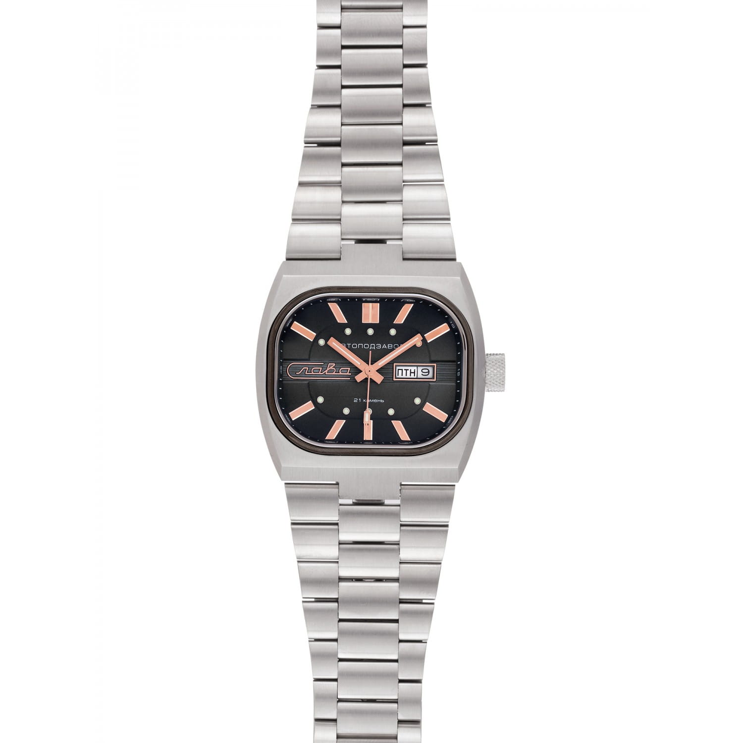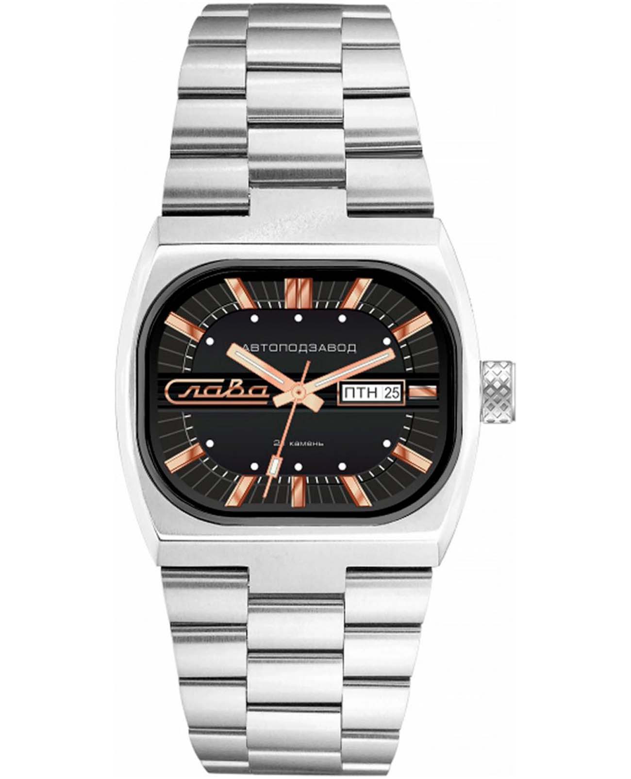 Российские часы Слава 3042706/100-8205 оснащены механизмом Miyota 8205, что обеспечивает исключительную надежность и точность хода. Корпус и браслет часов выполнены из стали, что придает им долговечность и устойчивость к внешним воздействиям. Сапфировое стеклоСапфировое стеклоПрочный и надёжный материал из кристалла сапфира синтетического происхождения, характеризующийся особой твёрдостью и устойчивостью к царапинам и повреждениям.. Класс водозащиты часов составляет 100 метров, позволит плавать, нырять и заниматься другими водными видами спорта. Эти часы идеально подойдут для повседневного использования, сочетая в себе стиль, надежность и функциональность. Стрелки и метки с люминесцентным покрытиемЛюминесцентное покрытиеПозволяет считывать показания времени в темноте. Производители наносят на стрелки, часовые индексы, безель или поверхность циферблата светонакопительный состав, дающий холодное свечение.. Окошки дня недели и даты находятся в положении 3 часа. Стальной браслет на раскладной застёжкеРаскладная застёжкаТакой тип застёжки используется только на браслетах из металла. Она никогда не раскрывается полностью, происходит разделение на 2 и более частей. Раскладывающая застёжка снизит вероятность потери часов к минимуму..