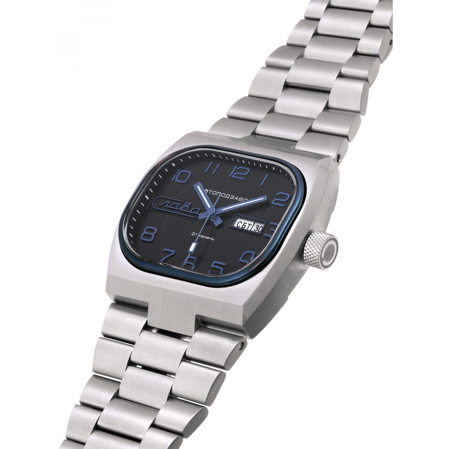 Российские часы Слава 3047711/100-8205 оснащены механизмом Miyota 8205, что обеспечивает исключительную надежность и точность хода. Корпус и браслет часов выполнены из стали, что придает им долговечность и устойчивость к внешним воздействиям. Сапфировое стеклоСапфировое стеклоПрочный и надёжный материал из кристалла сапфира синтетического происхождения, характеризующийся особой твёрдостью и устойчивостью к царапинам и повреждениям.. Класс водозащиты часов составляет 100 метров, позволит плавать, нырять и заниматься другими водными видами спорта. Эти часы идеально подойдут для повседневного использования, сочетая в себе стиль, надежность и функциональность. Стрелки с люминесцентным покрытиемЛюминесцентное покрытиеПозволяет считывать показания времени в темноте. Производители наносят на стрелки, часовые индексы, безель или поверхность циферблата светонакопительный состав, дающий холодное свечение.. Окошки дня недели и даты находятся в положении 3 часа. Стальной браслет на раскладной застёжкеРаскладная застёжкаТакой тип застёжки используется только на браслетах из металла. Она никогда не раскрывается полностью, происходит разделение на 2 и более частей. Раскладывающая застёжка снизит вероятность потери часов к минимуму..