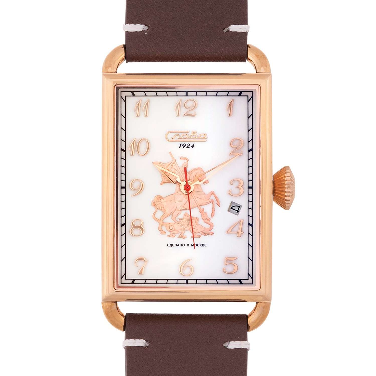 Часы Слава Москва 8703785/300-2414 — это воплощение элегантности и стиля, которое станет идеальным дополнением к вашему деловому гардеробу. Созданные в России, они оснащены надежным механическим механизмом калибра Слава 2414. Корпус выполнен из высококачественной стали с PVDPVDУльтратонкое покрытие наносится в технике вакуумного напыления, сочетает в себе нитрид титана особой прочности со слоем золота или оксида хрома. Несёт в себе декоративную или защитную функцию. покрытием, что обеспечивает долговечность и изысканный внешний вид. Белый циферблат украшен изображением Георгия Победоносца и защищен прочным сапфировым стекломСапфировое стеклоПрочный и надёжный материал из кристалла сапфира синтетического происхождения, характеризующийся особой твёрдостью и устойчивостью к царапинам и повреждениям., которое устойчиво к царапинам. Арабские цифры и окошко даты, расположенное между отметками 3 и 4 часа, добавляют функциональности и удобства в использовании. Задняя крышка, крепящаяся на 4 винтах, украшена надписью «Москва», подчеркивая уникальность и оригинальность модели. Кожаный ремешок с классической застежкой и системой быстрой замены не только обеспечивает комфорт, но и позволяет легко менять его по вашему желанию. Часы обладают водозащитой 50WR, что делает их подходящими для ежедневного ношения. Компактные габариты и вес в 70 грамм делают их удобными и практически незаметными на запястье. Эта лимитированная серия выпущена в количестве всего 500 экземпляров, что придает особую ценность и эксклюзивность вашему выбору. Часы поставляются в стильной подарочной упаковке, что делает их отличным подарком для ценителей высокого качества и утонченного дизайна.