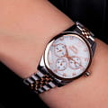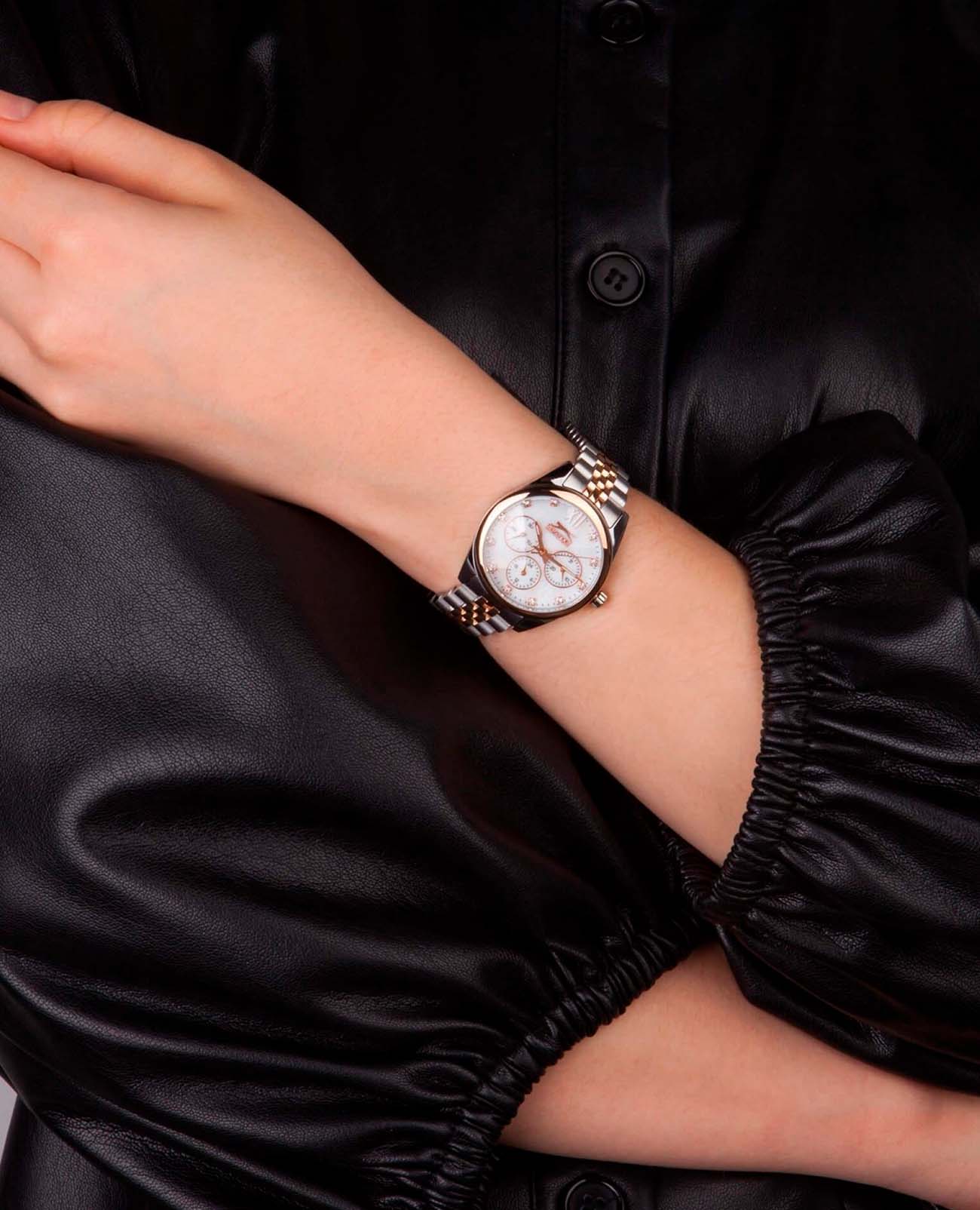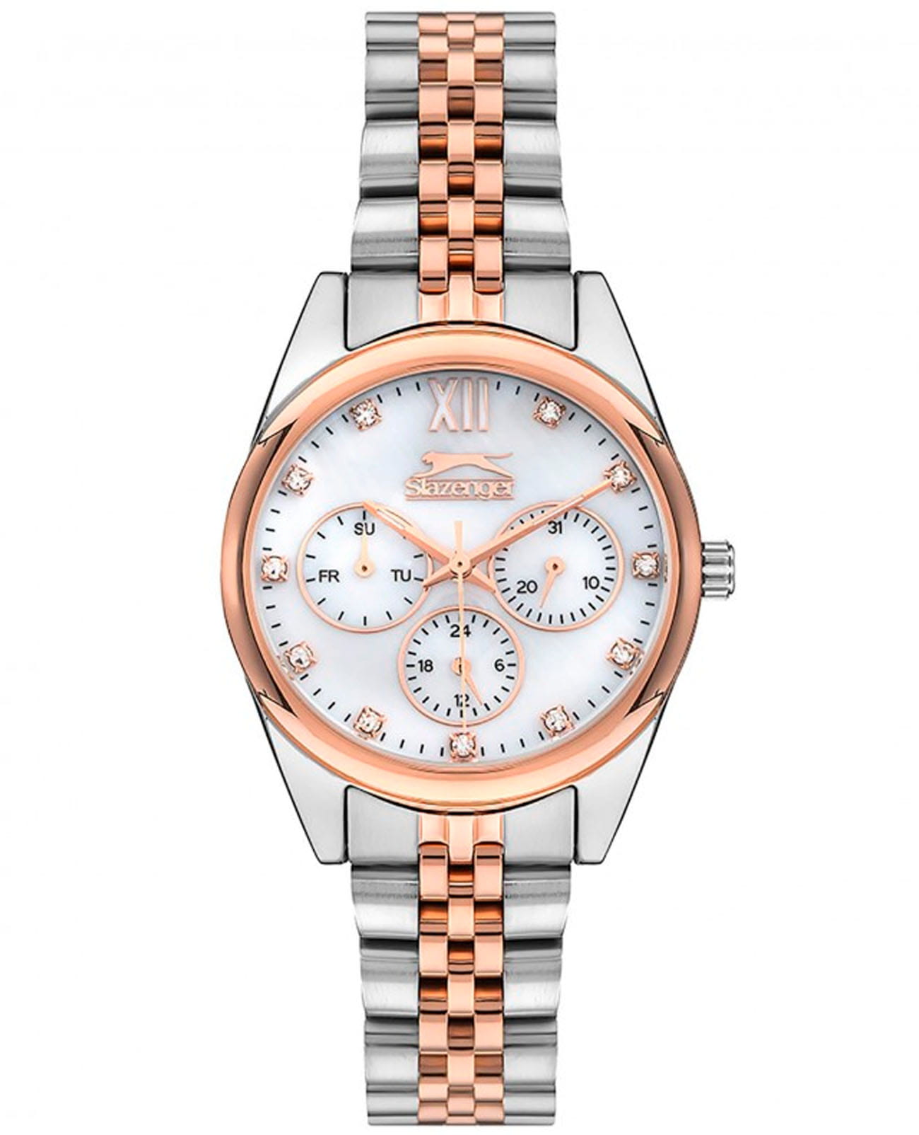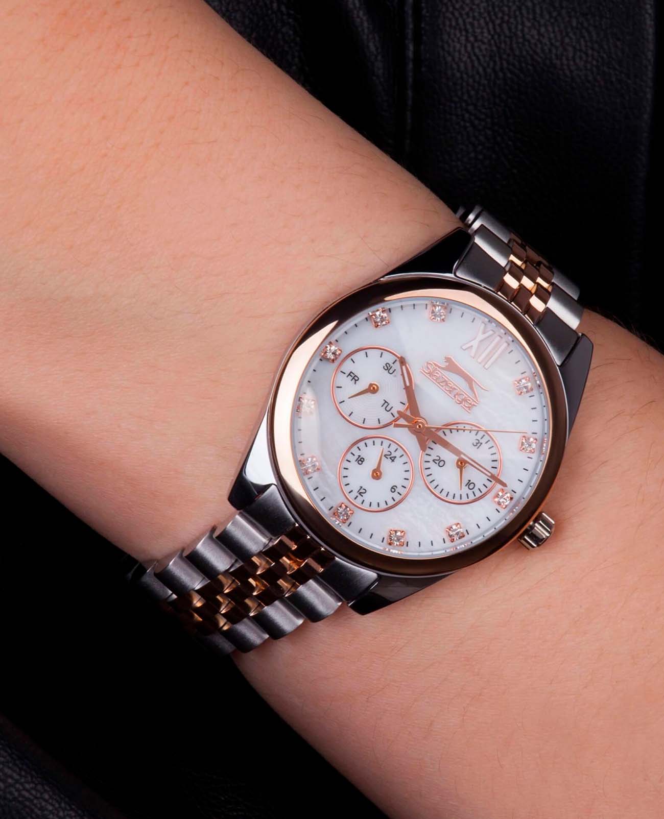Женские наручные часы Slazenger SL.09.1990.4.01 сочетают в себе элегантный дизайн и практичность современных технологий. Модель обладает круглым корпусом диаметром 34 мм, изготовленным из суперметалла, что обеспечивает высокую устойчивость к внешним воздействиям. БезельБезельВнешний ободок, закрепляющий стекло. В спортивных часах так называется поворотное кольцо с делениями на циферблате, выполняет роль таймера – замеряет отрезки времени на шкале. Неподвижный безель – элемент декора. Однонаправленно вращающийся безель на дайверских часах позволяет фиксировать моменты погружения и выныривания на поверхность. с IP-покрытиемIP-покрытиеМетод ионного напыления. Демонстрирует повышенную устойчивость к истиранию, окислению и химическим веществам. Под воздействием высокого давления и температуры около 1500°C молекулы металла надёжно соединяются с частицами корпуса часов. Браслет выполнен из того же материала  на раскладной застёжкеРаскладная застёжкаТакой тип застёжки используется только на браслетах из металла. Она никогда не раскрывается полностью, происходит разделение на 2 и более частей. Раскладывающая застёжка снизит вероятность потери часов к минимуму., гарантирующей комфортное ношение. Белый циферблат оснащен индексами для лучшей читаемости времени и дополнен функцией календаря. Для защиты применяется минеральное стеклоМинеральное стеклоМинеральное стекло представляет собой искусственно выращенный минерал кварца. Такое стекло отличается особой устойчивостью к повреждениям и царапинам. Уступает по некоторым качествам сапфировому стеклу., обеспечивающее прочную защиту от царапин. Часы работают на японском кварцевом механизме, что гарантирует точное время без необходимости подзаводки. Водонепроницаемость составляет 3 атмосферы (30 метров), что позволяет использовать их в повседневной жизни, но не рекомендуется для плавания или занятий водными видами спорта.