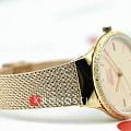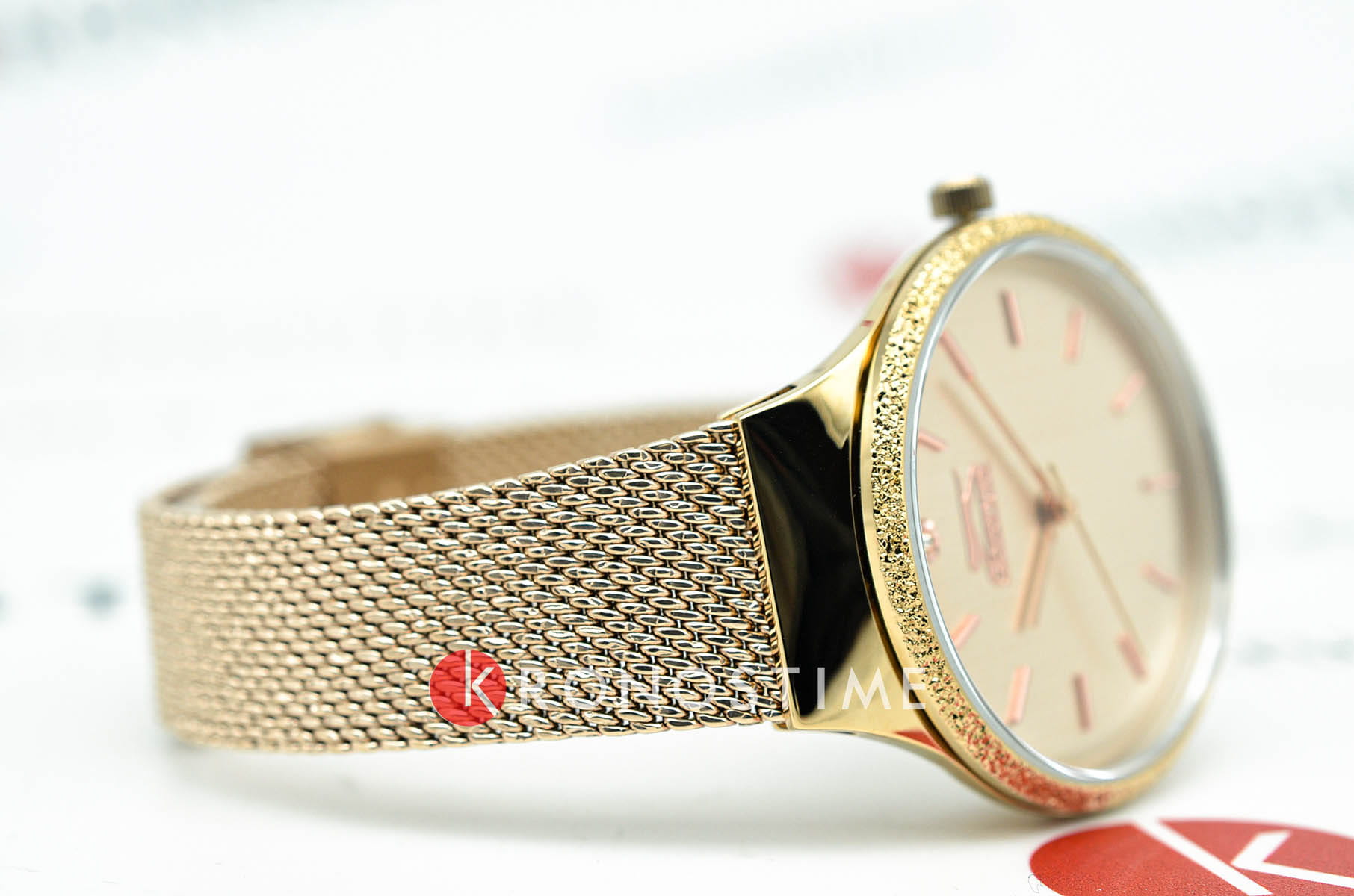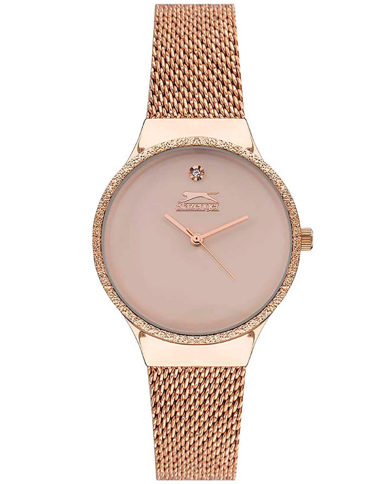Женские наручные часы Slazenger SL.09.2015.3.02 сочетают в себе элегантный дизайн и надежность современных технологий. Модель обладает круглым корпусом диаметром 35 мм, изготовленным из суперметалла с IP-покрытиемIP-покрытиеМетод ионного напыления. Демонстрирует повышенную устойчивость к истиранию, окислению и химическим веществам. Под воздействием высокого давления и температуры около 1500°C молекулы металла надёжно соединяются с частицами корпуса часов. розового золота, что обеспечивает высокую устойчивость к внешним воздействиям. Браслет миланского плетения из суперметалла с IP-покрытиемIP-покрытиеМетод ионного напыления. Демонстрирует повышенную устойчивость к истиранию, окислению и химическим веществам. Под воздействием высокого давления и температуры около 1500°C молекулы металла надёжно соединяются с частицами корпуса часов. на раскладном замкеРаскладной замокДанный вариант застежки используется только на часах с металлическим браслетом. Отличительная особенность такого крепления в том, что длина браслета становится универсальной и вы можете самостоятельно отрегулировать нужный вам размер – застежка просто двигается по браслету часов., что гарантирует комфортное ношение и стильный внешний вид. Циферблат украшен индексами и кристаллами, оснащен тремя стрелками для показания часов, минут и секунд. Для защиты применяется минеральное стеклоМинеральное стеклоМинеральное стекло представляет собой искусственно выращенный минерал кварца. Такое стекло отличается особой устойчивостью к повреждениям и царапинам. Уступает по некоторым качествам сапфировому стеклу., обеспечивающее прочную защиту от царапин. Часы работают на японском кварцевом механизме, что гарантирует точное время без необходимости подзаводки. Водонепроницаемость часов достигает 5 атмосфер (50 метров), что позволяет использовать их при контакте с водой, например, во время мытья рук или попадания брызг, однако не рекомендуется для плавания.