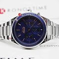 Циферблат синего цвета декорирован стрелками с люминесцентным покрытиемЛюминесцентное покрытиеПозволяет считывать показания времени в темноте. Производители наносят на стрелки, часовые индексы, безель или поверхность циферблата светонакопительный состав, дающий холодное свечение., которые обеспечивают читаемость времени даже в условиях недостаточной освещенности. Для защиты используется минеральное стеклоМинеральное стеклоМинеральное стекло представляет собой искусственно выращенный минерал кварца. Такое стекло отличается особой устойчивостью к повреждениям и царапинам. Уступает по некоторым качествам сапфировому стеклу., обеспечивающее прочную защиту от царапин.