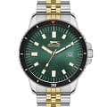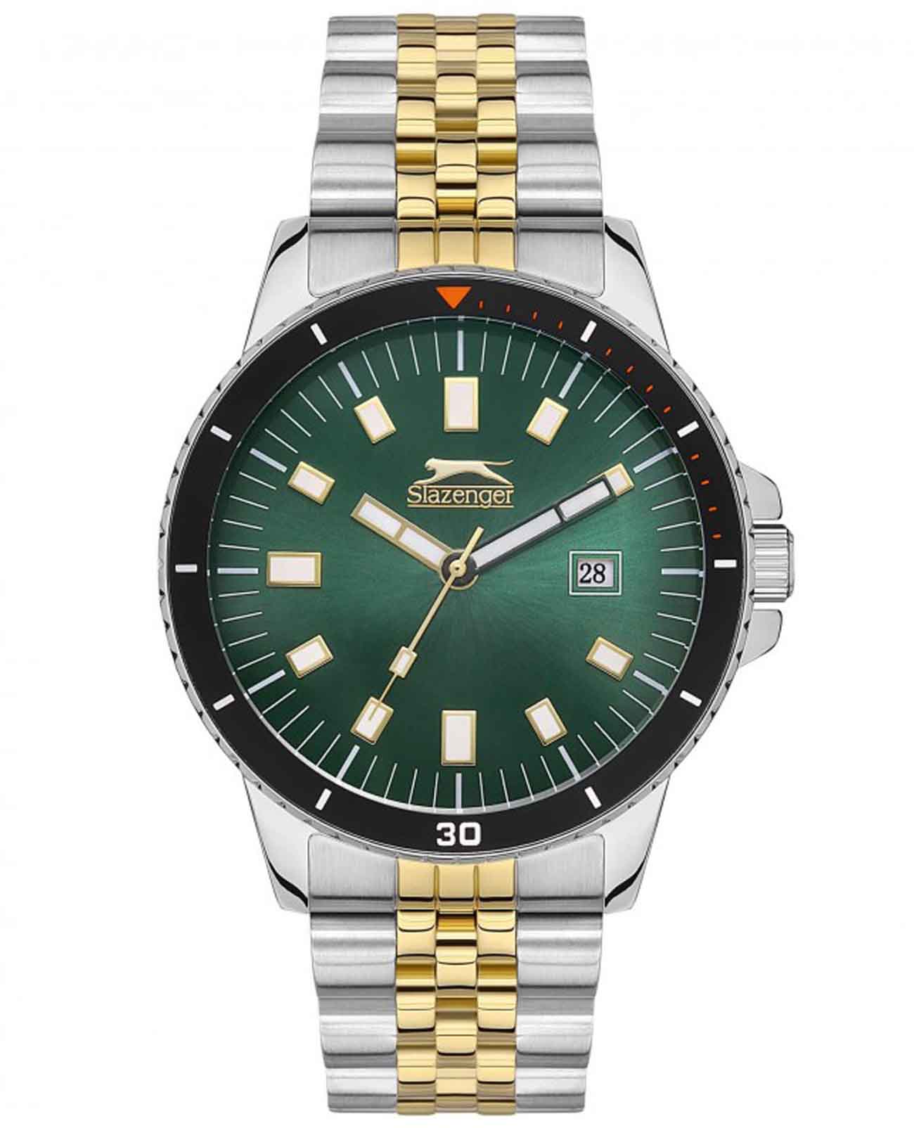 Часы Slazenger SL.09.2135.1.04 воплощают в себе элегантность и практичность, идеально подходящие для современных мужчин. Их зеленый циферблат, защищенный минеральным стекломМинеральное стеклоМинеральное стекло представляет собой искусственно выращенный минерал кварца. Такое стекло отличается особой устойчивостью к повреждениям и царапинам. Уступает по некоторым качествам сапфировому стеклу., заключен в серебристый корпус диаметром 45 мм, который изготовлен из прочного суперметалла. Неподвижный безельБезельВнешний ободок, закрепляющий стекло. В спортивных часах так называется поворотное кольцо с делениями на циферблате, выполняет роль таймера – замеряет отрезки времени на шкале. Неподвижный безель – элемент декора. Однонаправленно вращающийся безель на дайверских часах позволяет фиксировать моменты погружения и выныривания на поверхность. с IP-покрытиемIP-покрытиеМетод ионного напыления. Демонстрирует повышенную устойчивость к истиранию, окислению и химическим веществам. Под воздействием высокого давления и температуры около 1500°C молекулы металла надёжно соединяются с частицами корпуса часов. черного цвета. Часы оснащены удобным окошком даты и стрелками контрастного цвета. Надежный кварцевый механизм обеспечивает точность, а водозащита 5 ATM делает их устойчивыми к воздействию воды. Стальной браслет из суперметалла с частичным IP-покрытиемIP-покрытиеМетод ионного напыления. Демонстрирует повышенную устойчивость к истиранию, окислению и химическим веществам. Под воздействием высокого давления и температуры около 1500°C молекулы металла надёжно соединяются с частицами корпуса часов. золотистого цвета имеет раскладную застёжкуРаскладная застёжкаТакой тип застёжки используется только на браслетах из металла. Она никогда не раскрывается полностью, происходит разделение на 2 и более частей. Раскладывающая застёжка снизит вероятность потери часов к минимуму., что подчеркивает современный стиль и позволяет легко снимать часы. Люминесцентное покрытиеЛюминесцентное покрытиеПозволяет считывать показания времени в темноте. Производители наносят на стрелки, часовые индексы, безель или поверхность циферблата светонакопительный состав, дающий холодное свечение. на стрелках и метках обеспечивает отличную видимость в темноте.