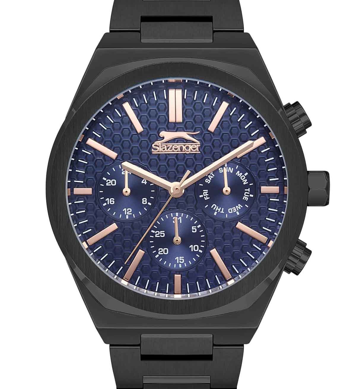 Часы Slazenger SL.09.2137.2.03 воплощают в себе элегантность и практичность, идеально подходящие для современных мужчин. Их синий циферблат с оригинальным рисунком в виде сот, защищен минеральным стекломМинеральное стеклоМинеральное стекло представляет собой искусственно выращенный минерал кварца. Такое стекло отличается особой устойчивостью к повреждениям и царапинам. Уступает по некоторым качествам сапфировому стеклу. и заключен в черный матовый корпус диаметром 44 мм из прочного суперметалла с IP-покрытиемIP-покрытиеМетод ионного напыления. Демонстрирует повышенную устойчивость к истиранию, окислению и химическим веществам. Под воздействием высокого давления и температуры около 1500°C молекулы металла надёжно соединяются с частицами корпуса часов.. Часы оснащены двойным форматом времени (12 и 24 часа), указателями дней недели и даты на дополнительных малых циферблатах. Надежный кварцевый механизм обеспечивает точность, а водозащита 5 ATM делает их устойчивыми к воздействию воды. Черный браслет из суперметалла с IP-покрытиемIP-покрытиеМетод ионного напыления. Демонстрирует повышенную устойчивость к истиранию, окислению и химическим веществам. Под воздействием высокого давления и температуры около 1500°C молекулы металла надёжно соединяются с частицами корпуса часов. имеет раскладную застёжкуРаскладная застёжкаТакой тип застёжки используется только на браслетах из металла. Она никогда не раскрывается полностью, происходит разделение на 2 и более частей. Раскладывающая застёжка снизит вероятность потери часов к минимуму., что подчеркивает современный стиль и позволяет легко снимать часы. Размер браслета (H1-H2): 24-20 мм.